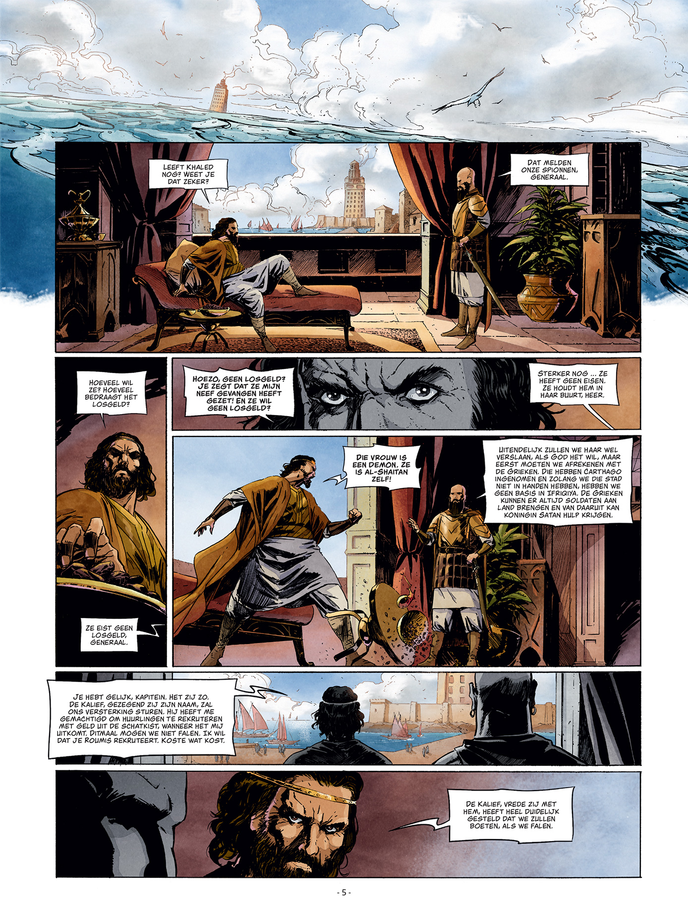 Hoewel sommige panelen een statische indruk kunnen wekken, weet de visuele uitvoering de grootse schaal van Kahina’s missie en de brutaliteit van de oorlog treffend vast te leggen.