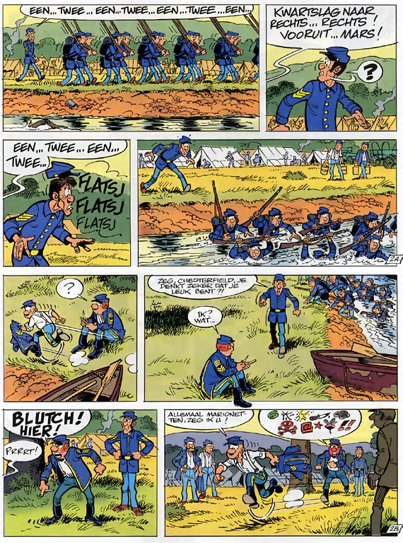 De reeks 'De Blauwbloezen' is een geslaagde mengeling van avontuur en humor. Cauvin gebruikt - zoals hij wel meer doet - historische anekdotes uit de Amerikaanse burgeroorlog om ons hilarische verhalen te vertellen over de perikelen in het leger, waar de hoogste officieren niet per se de slimste zijn... Willy Lambil heeft zich uitstekend gedocumenteerd en maakt van zijn pagina's heldere, intelligente kunstwerkjes. Het resultaat is amusement op hoog niveau, dat door een nog steeds groeiend publiek wordt gewaardeerd.