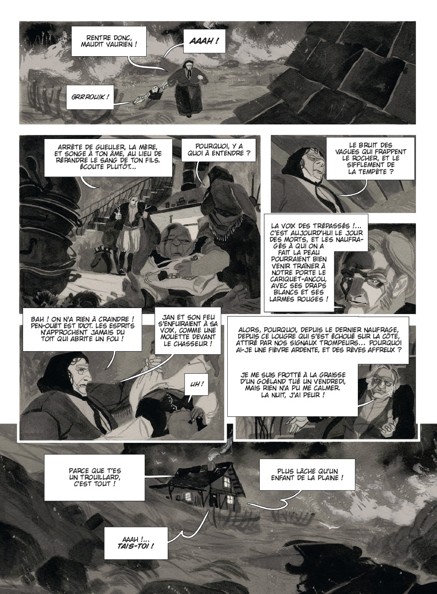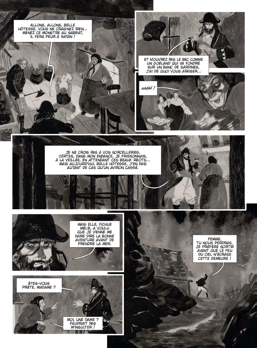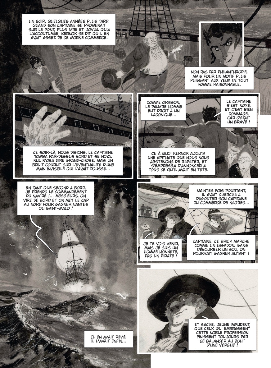 Un bon pirate est un pirate mort. C'est sur les côtes bretonnes, là où les vagues se brisent avec violence contre les rochers, que Kernok le pirate est venu consulter la sorcière de Pampoul. Le vieux loup de mer, habitué aux pillages sanglants, veut connaître son avenir. La vieille femme va lui prédire, le pire... sa dernière heure serait venue, il ne lui resterait que 13 jours à vivre ! Refusant de se laisser berner par de telles paroles, le capitaine s'empresse de reprendre la mer. A bord de l'Epervier, il retrouve son second, maitre Zéli, le mousse Grain-de-Sel et sa maîtresse, la douce Mélie. Bientôt à l'horizon, apparaît le San Pablo, aux cales bien remplies. Après un véritable carnage, Kernok s'empare du navire et de son inestimable butin ! L'équipage festoie toute la nuit après avoir massacré les derniers prisonniers. Alors que Kernok savoure sa victoire les voiles d'un vaisseau anglais s'approchent dangereusement au petit jour... La sorcière aurait-elle vu juste ? Frédéric Brrémaud nous livre une flamboyante et néanmoins fidèle adaptation du roman d'Eugène Sue paru en 1830 ; alors qu'Alessandro Corbettini, jeune dessinateur virtuose nous éblouit avec ses planches magistrales, aux lavis fourmillants de détails qui transcendent l'océan et l'univers de la piraterie.