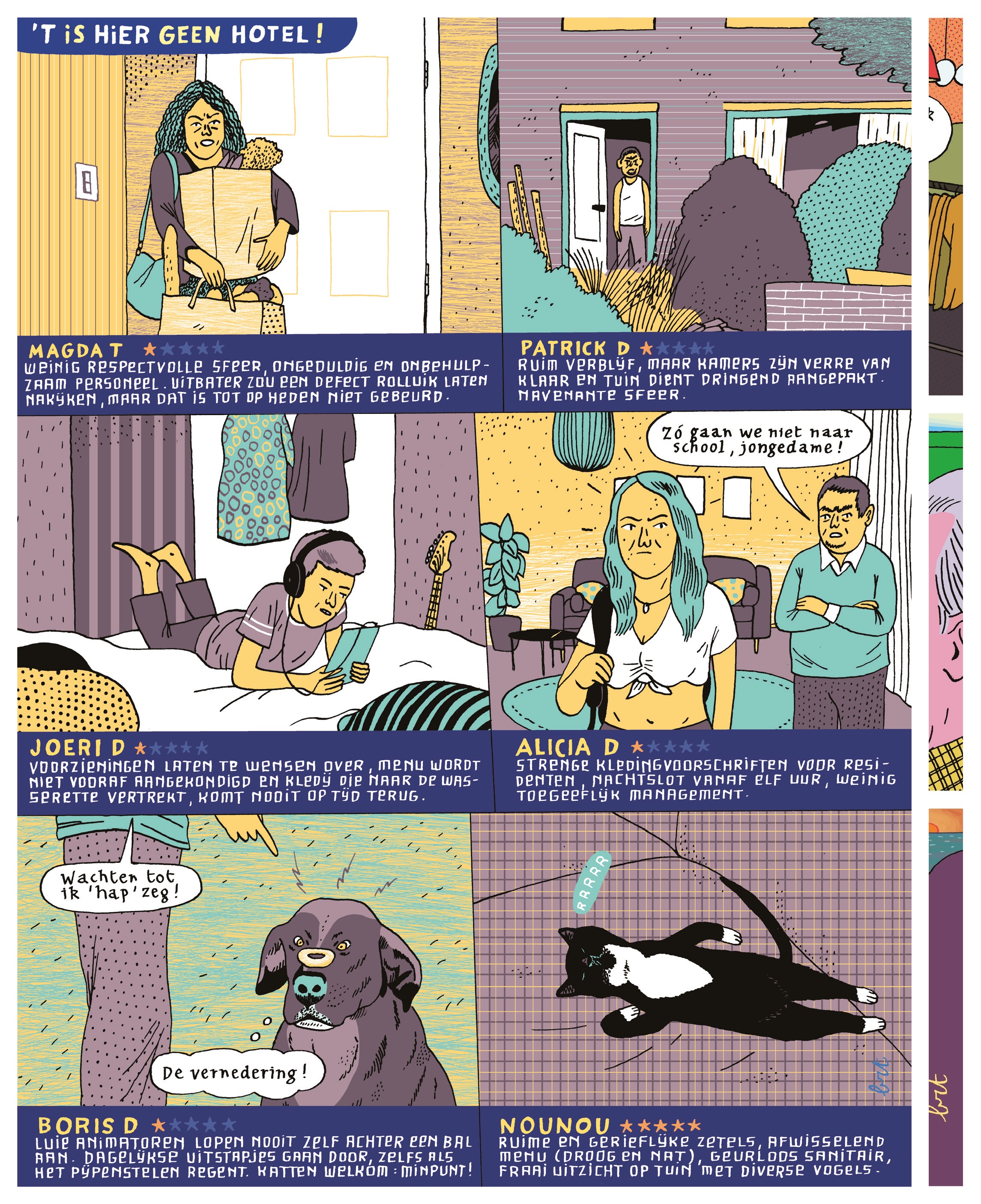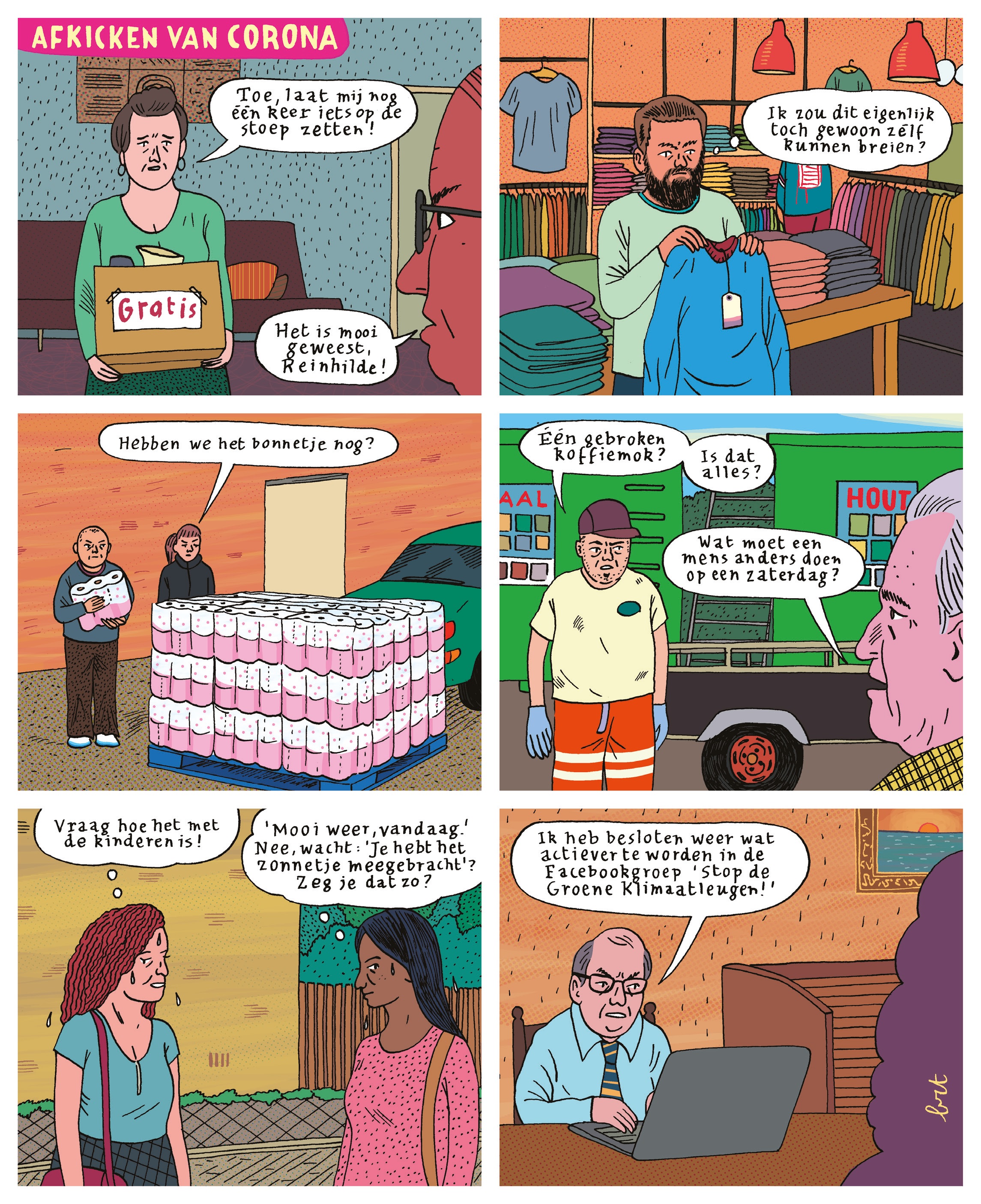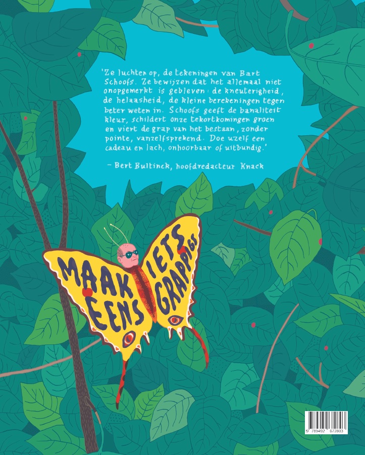 Ze luchten op, de tekeningen van Bart Schoofs. Ze bewijzen dat het allemaal niet onopgemerkt is gebleven: de kneuterigheid, de helaasheid, de kleine berekeningen tegen beter weten in. Schoofs geeft de banaliteit kleur, schildert onze tekortkomingen groen en viert de grap van het bestaan, zonder pointe, vanzelfsprekend.