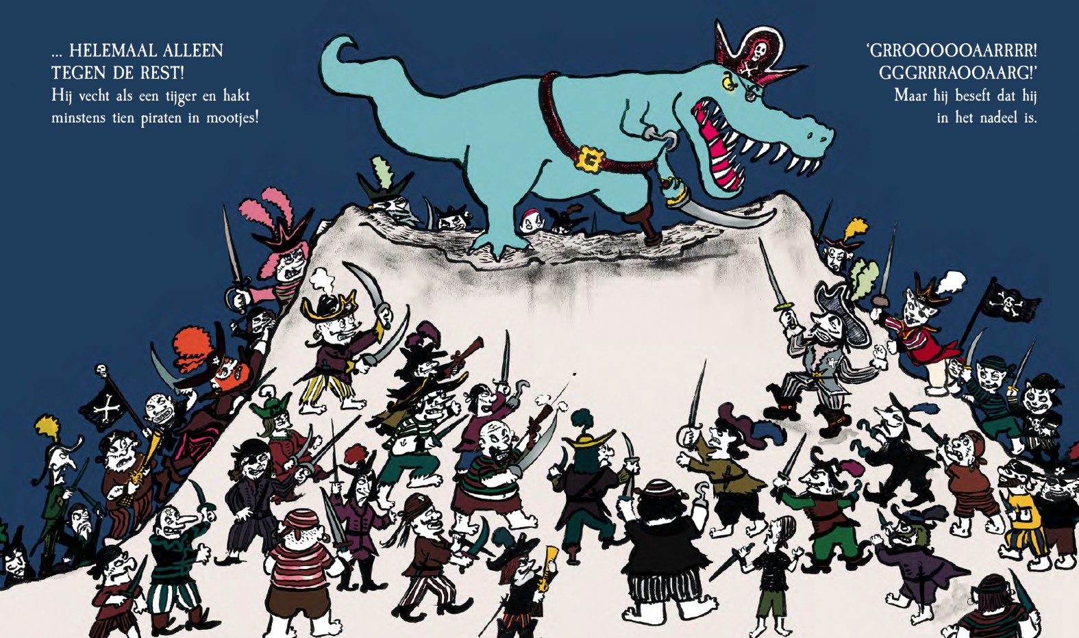De verschrikkelijke Piratosaurus wil alle schatten van de zeeën en oceanen hebben. Hij plundert schepen recht onder de neuzen van andere piraten en grijpt elke kans om de buit van de vrijbuiters te bemachtigen. In zijn uiterst geheime grot stapelt hij gouden munten, smaragden, robijnen, diamanten en miljarden saffieren op… Alle piratenleiders dromen ervan om zijn fabelachtige, legendarische grot te vinden. Ze besluiten zich te verenigen. ALLEN TEGEN PIRATOSAURUS!