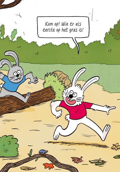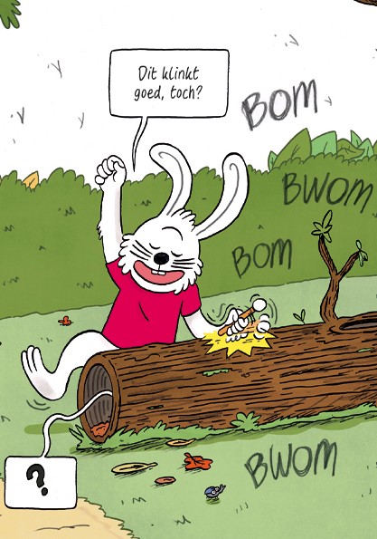 Twee nieuwsgierige konijnen vinden trommelstokken in het bos. Maar... waar is de trommel? Zo begint een vrolijke speurtocht door het bos!