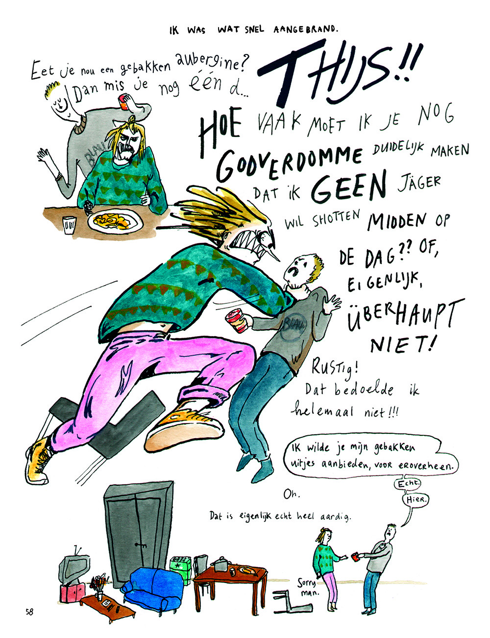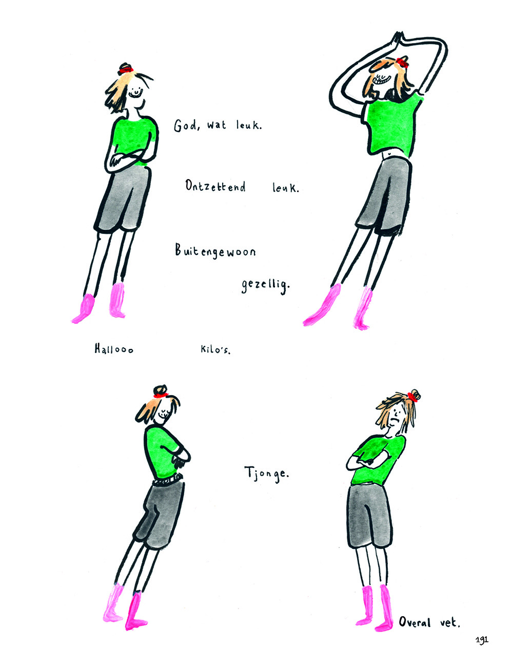 Debuut van de Nederlandse Micky Dirkzwager met een openhartig, maar bovenal grappig opgevat album over een eetstoornis en bij uitbreiding over hoe je je angsten en fobieën kunt overwinnen. 'Micky Dirkzwager (geboren in Haarlem, 1998) maakte dit boek als afstudeeropdracht aan de HKU in Utrecht en presenteerde het aan Scratch tijdens een Strippitch in Brussel. We vielen uit onze stoel van het lachen bij het lezen van haar boek en dat gebeurt ons niet vaak! Zo kun je via een omweg door België toch terecht komen waar je hoort. In Knipperen & Ademen volgen we Micky kriskras door haar opleiding heen, waar ze op de rand van een zenuwinzinking erachter komt dat het niet een burn-out is waaraan ze lijdt, maar een eetstoornis ('Die krijg je er gratis bij'). Met een fikse dosis humor tekent ze de wereld en zichzelf. Spontaniteit en beweging zijn heel belangrijk in haar tekeningen. Anders slaan ze dood, net als bier. Hoe ga je om met de beren die je op de weg ziet, maar die je ook troosten als je het allemaal niet meer ziet zitten? Maar misschien belangrijker nog: hoe kom je van die beren af? Het is indrukwekkend hoe Micky nu al zoveel verschillende stijlen beheerst en in een enkel verhaal kan laten samenspelen. Daarnaast heeft ze een volstrekt eigen, originele stem. Een mooie orkestratie van fraai beeld met sterke teksten en rake dialogen: dat is een goed beeldverhaal. En dan valt er nog veel te lachen ook.'