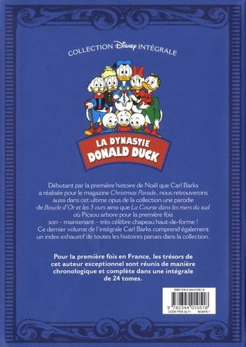 Dernier volume d'une intégrale indispensable ! Avec ce dernier volume, vous aurez enfin accès à l'intégralité de l'oeuvre de Carl Barks, l'auteur le plus réputé et le plus talentueux des aventures de Donald. Aventure, mystère et magie sont bien sûr au rendez-vous de ces histoires, mais aussi humour, amitié et cacophonie familiale ! En introduction, chaque volume propose un appareil critique de l'oeuvre de l'auteur, et chaque histoire est précédée d'une courte fiche d'identité bibliographique permettant de la replacer dans le contexte de sa première publication. Vendue à plus de 200 000 exemplaires, lauréate du Fauve Patrimoine lors du Festival d'Angoulême 2012, cette intégrale est idéale pour les admirateurs de Carl Barks et les collectionneurs bibliophiles. Dans cet ultime volume, vous retrouverez en bonus un index complet de toutes les histoires publiées.