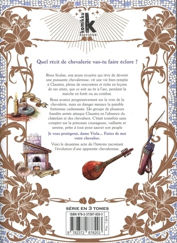 Quel récit de chevalerie vas-tu faire éclore ? Rosa Scalae, une jeune écuyère qui rêve de devenir une puissante chevaleresse, vit une vie bien remplie à Claustra, pleine de rencontres et riche en leçons de ses aines, que ce soit au tir à l'arc, pendant la marche en foret ou au combat. Rosa avance progressivement sur la voie de la chevalerie, mais un danger menace la paisible forteresse cadenassée. Un groupe de plusieurs bandits armés attaque Claustra en l'absence du châtelain et des chevaliers. C'était toutefois sans compter sur la princesse courageuse, vaillante et sereine, prête à tout pour sauver son peuple Je vous protégerai, dame Viola... Faites de moi votre chevalier. Voici le deuxième acte de l'histoire racontant l'évolution d'une apprentie chevaleresse.
