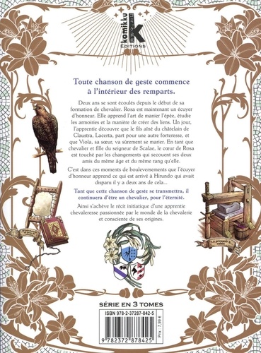Toute chanson de geste commence à l'intérieur des remparts. Deux ans se sont écoulés depuis le début de sa formation de chevalier. Rosa est maintenant un écuyer d'honneur. Elle apprend l'art de manier l'épée, étudie les armoiries et la manière de créer des liens. Un jour, l'apprentie découvre que le fils aîné du châtelain de Claustra, Lacera, part pour une autre forteresse, et que Viola, sa soeur, va sûrement se marier. En tant que chevalier et fille du seigneur de Scalae, le coeur de Rosa est touché par les changements qui secouent ses deux amis du même âge et du même rang qu'elle. C'est dans ces moments de bouleversements que l'écuyer d'honneur apprend ce qui est arrivé à Hirundo qui avait disparu il y a deux ans de cela... Tant que cette chanson de geste se transmettra, il continuera d'être un chevalier, pour l'éternité. Ainsi s'achève le récit initiatique d'une apprentie chevaleresse passionnée parle monde de la chevalerie et consciente de ses origines.