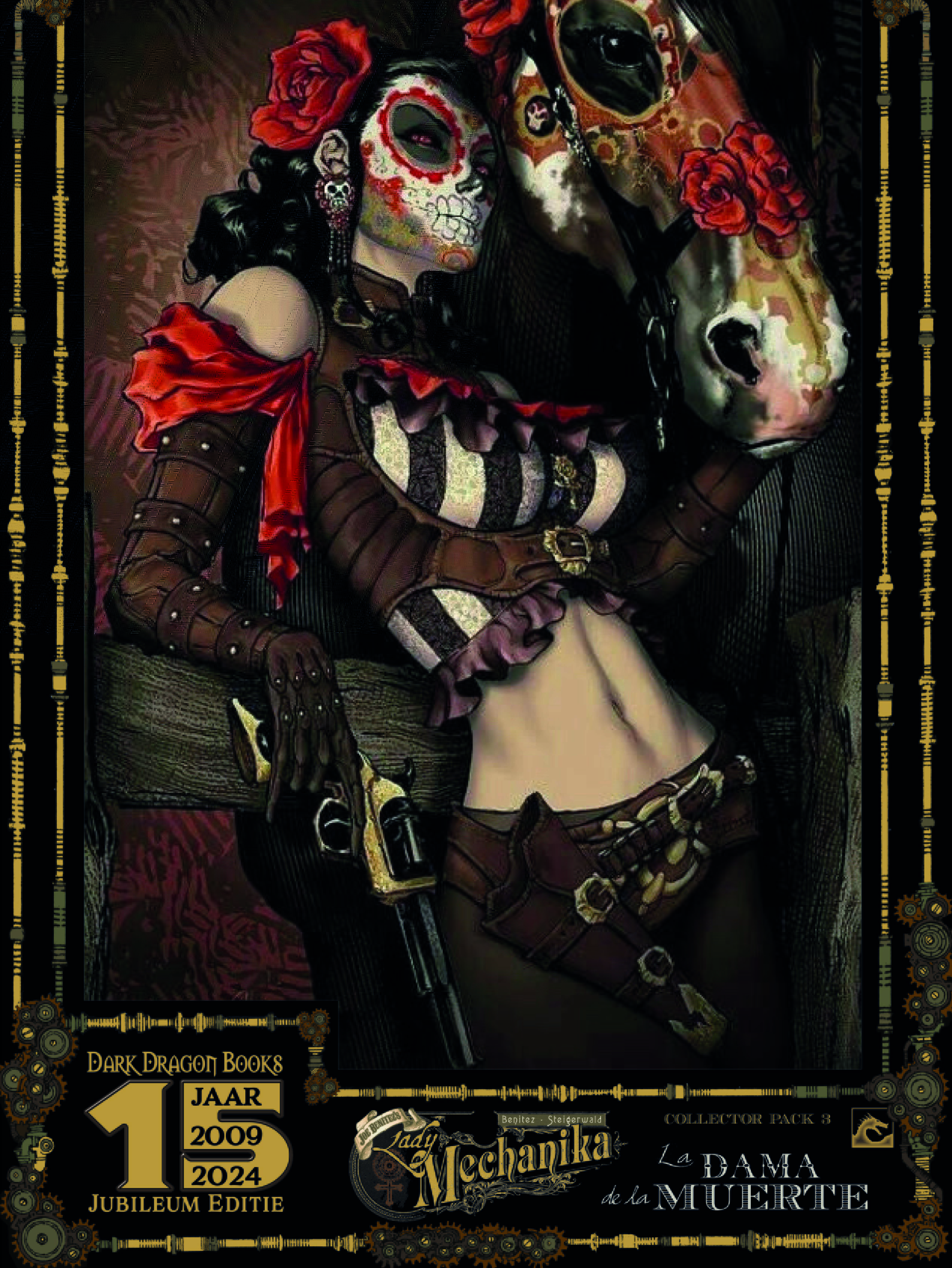 De volledige set van 5 Lady Mechanika Collector Pack Jubileum Edities inclusief fraaie Silver print Na een tragisch verlies besluit Lady Mechanika er even tussenuit te gaan. Net op tijd voor het Día de los Muertos-feest komt ze aan in een klein Mexicaans dorpje. Maar de festiviteiten nemen een doodenge wending door de komst van de Jinetes del Infierno, de mythische ruiters uit de hel. Het belooft een heel speciale Dag van de Doden te worden... La Dama de la Muerte deel 1 & 2 + De weesjongens van West Abbey integraal Tekst en tekeningen: Joe Benitez ISBN: 9789463730396 Softcover 3 x 56 blz.