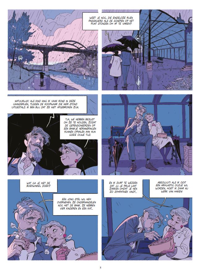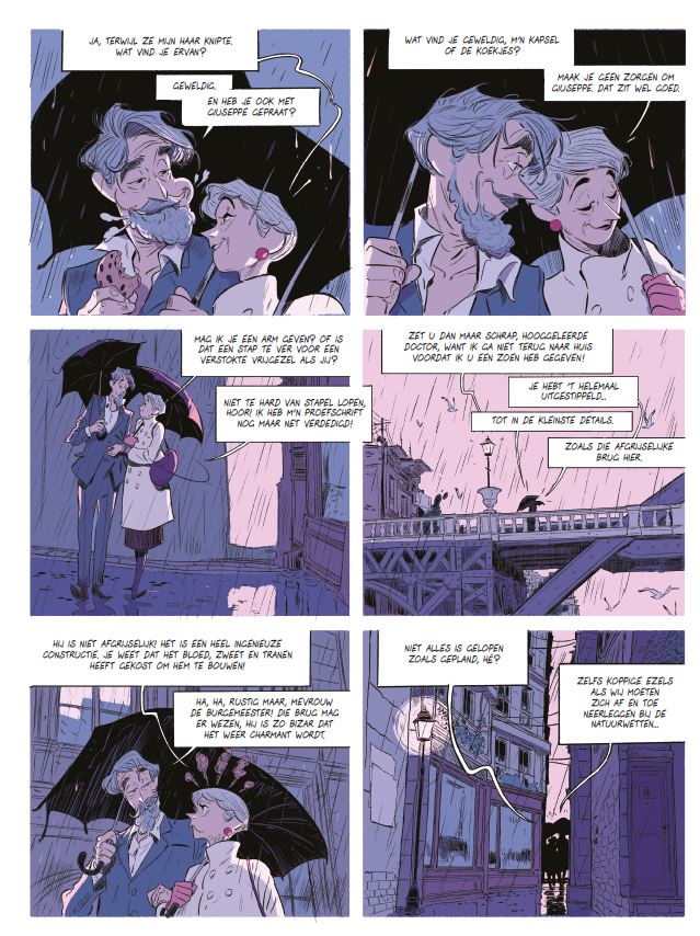 Dit verhaal vertrekt aan het eindpunt. Het is genieten van deze unieke opbouw: We beginnen met hoofdstuk 20 en we tellen af naar hoofdstuk 1. Zalig spelen met tijd. De gedachten van twee gepensioneerden lopen opvallend samen en toch zo ver uiteen. Twee mensen, hartstochtelijk verliefd, maar ze kunnen niet bij elkaar zijn. Zeno erfde een boekwinkel maar is gewoonlijk op 'lange omvaart'. Hij heeft, na vele jaren, zijn studie afgemaakt en wil zijn doctoraatsthesis verdedigen. Ana Dellacasa is juist met pensioen. Ze is jarenlang burgemeester geweest en is gehuwd met Giuseppe. Ze hebben een dochter, Claudia. De rode draad is de bouw van de brug. De liefdespuzzel moeten we zelf leggen. Zeno Simia probeert te bewijzen dat de tijd ook achteruit kan lopen. ("Kon dit ook maar in het echt ... dan zou ik nog altijd moeten kennismaken met dit wondermooie verhaal.") 'Wat zal er over vier jaar van ons worden, liefste? Binnenkort hebben we geen uitvluchten meer.' Af en toe moesten we ook wel eens aan 'Normal People' (Netflix) denken. Toch ook wel een compliment meen ik! En wat een schitterende cover met die weerspiegeling in de plas en die paraplu's die wel een hartje lijken, eindelijk! Eigenlijk staat de cover op zijn kop. Wat je ziet is de weerspiegeling in het water en zijn de onderste benen de 'echte'. Je kan de cover dus omdraaien.