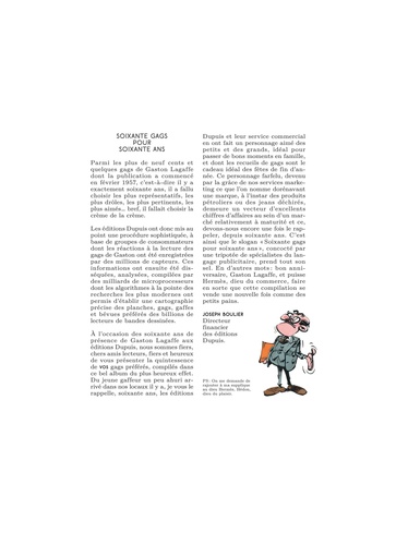 M'enfin ? ! Qui aurait cru que soixante ans seraient passés si vite ? Soixante ans de bonne humeur, d'inventions toutes plus abracadabrantes les unes que les autres, d'explosions et de dégâts des eaux, de rires et de contrats détruits, avec une mouette, un chat, des souris, des instruments de musique et des responsables qui claquent les portes avant de tomber dans les escaliers... Gaston Lagaffe, c'est soixante années de catastrophes délirantes et un antihéros devenu culte, qu'il fallait bien célébrer aujourd'hui pour cette longue carrière ! Le personnage fétiche de Franquin, dont toute ressemblance avec une personne réelle serait totalement fortuite, a su toucher le coeur de nombreuses générations de lecteurs grâce à son humour spontané et à son naturel poétique. Aujourd'hui, le roi de la paresse souffle ses soixante bougies (et aucune ride !), l'occasion de revenir sur quelques-uns de ses meilleurs gags avec un plaisir certain. Sablez le champagne et sortez les confettis, cet anniversaire va faire du bruit !