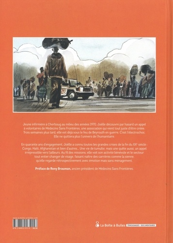 Jeune infirmière à Cherboug au milieu des années 70, Joëlle découvre par hasard les coordonnées de Médecins sans Frontières dans un magazine au salon de coiffure. Trois semaines plus tard, la voilà sous le feu de Beyrouth en guerre. C'est l'électrochoc, il lui est désormais impossible de reprendre une vie " normale " . En quarante ans, Joëlle a connu toutes les grandes crises de la fin du XXe siècle : Congo, Haïti, Afghanistan et bien d'autres... Une vie de tarmacs et de grandes organisations internationales d'aide comme la Croix-Rouge ou Aide Médicale Internationale. Au fil de ses voyages, elle voit son activité bénévole se structurer, et naître des carrières d'humanitaire, comme la sienne, qu'elle regarde rétrospectivement avec émotion mais sans ménagement.