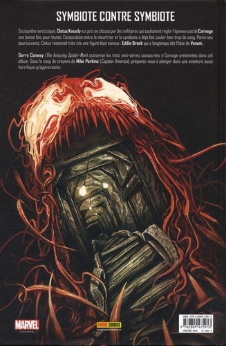 Symbiote contre symbiote. Sociopathe narcissique, Cletus Kasady est pris en chasse par des militaires qui souhaitent régler l'épineux cas de Carnage une bonne fois pour toutes. L'association entre le meurtrier et le symbiote a déjà fait couler bien trop de sang. Parmi ses poursuivants, Cletus reconnait très vite une figure bien connue : Eddie Brook qui a longtemps été l'hôte de Venom... Gerry Conway (The Amezing Spider-Man) scénarise les trois mini-séries consacrées à Carnage présentées dans cet album. Sous le coup de crayons de Mike Perkins (Captain America), préparez-vous à plonger dans une aventure aussi horrifique qu'oppressante.