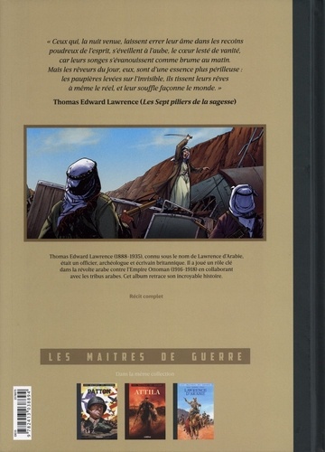 Ils sont les guerriers légendaires de l'Histoire, dont le courage, l'ambition et le génie militaire ont changé la face du monde et le destin des peuples, les plus grands stratèges les de tous les temps. Thomas Edward Lawrence (1888-1935), connu sous le nom de Lawrence d'Arabie, était un officier, archéologue et écrivain britannique. Il a joué un rôle clé dans la révolte arabe contre l'Empire Ottoman (1916-1918) en collaborant avec les tribus arabes. Cet album retrace son incroyable histoire.