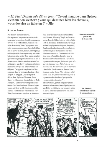Le cheval, c'est l'essence du Western. Jijé décompose sa course avec l'aide de Muybridge, Godwin, Morris et Franquin, et utilise cette formidable énergie animale pour dynamiser sa bande. Jerry Spring devient un véritable Opéra Equestre, une célébration de la gent chevaline. Jerry Spring dans sa force primale du noir et du blanc. Incontournable !