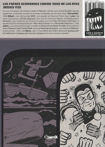 Les frères Hernandez corme vous ne les avez jamais vus. Si vous connaissez les histoires Locas et Palomar, sachez que Love & Rockets regorge également d'histoires courtes et de séries imaginées par les trois frères Hernandez. Côté Gilbert, vous découvrirez BEM, une épopée de Science-Fiction (avec Luba), les récits dystopiques d'Errata Stigmata, ainsi que les aventures légères de Musique pour Monstres, sans oublier les one-shots incroyables que sont Frida, Un Conte Folklorique, et les éblouissants autobiographiques"Mon récit d'amour" et "Hernandez Satyricon". Côté Jaime, vous retrouverez la saga complète de Rocky et son Robot Fumble, les exubérants récits Chasse à l'oeuf et Notre Noël, , ainsi que Peintures de Guerre, une histoire de Palomar, et plus encore... Enfin, côté Mario, celui-ci vous délivre des thrillers déchirants Quelque part en Californie et Quelque part sous les tropiques ainsi que d'autres surprises !