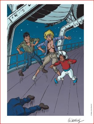 Je dacht misschien dat de avonturen van Natasja’s grootmoeder en Walters grootvader erop zaten, na wat er in Nieuw-Caledonië gebeurde? Maar nee hoor, gelukkig! Onder een hemel waarin een mysterieus licht fonkelt, varen ze langs een cruiseschip dat stilligt, midden in de Stille Oceaan. De passagiers en de bemanning liggen allemaal te slapen, en de kluis is opengebroken. Een geslaagde truc van een bende vreemde inbrekers, en vast niet de laatste… Tenzij Natasja’s grootmoeder er een stokje voor steekt… want zij is niet alleen even moedig en verleidelijk als haar kleindochter, maar ze heeft nog een troef: Aprillied, haar lievelingsrevolver!