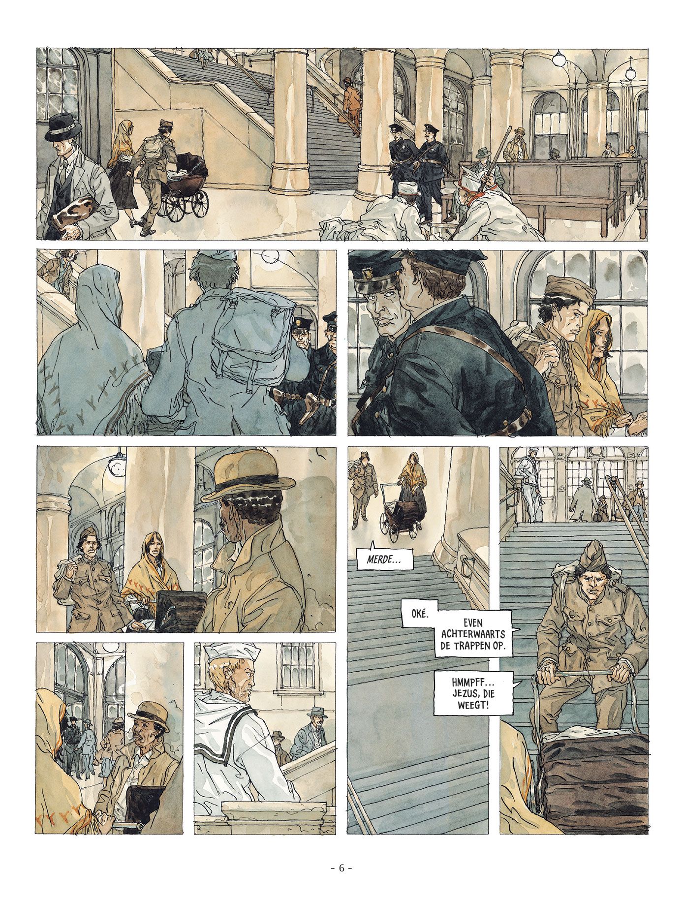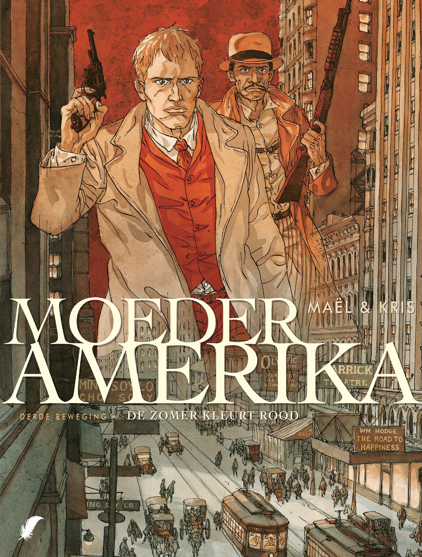 Gemiddelde score 4 / 5De openingsscène van dit derde deel van Moeder Amerika zal bij velen een aha-erlebnis opwekken. Scenarist Kris (die het volgende album van De Blauwbloezen heeft geschreven) en tekenaar Maël hebben zich immers duidelijk laten inspireren door de legendarische stationsscène uit Brian De Palma’s The Untouchables en dat was dan weer een geslaagde hommage aan Sergej Eisensteins Pantserkruiser Potemkin. In de kinderwagen van Max, Tina en Julien ligt echter geen slapende baby, maar een krachtig bompakket dat half Chicago op zijn grondvesten zal doen daveren. Na hun avontuur in Mexico is het revolutionaire trio immers de grens overgestoken en worden ze voor de kar van de Amerikaanse extremisten gespannen. Een album met heel wat actie, goed gedocumenteerd, een nerveuze mise-en-scène en bloed dat over de pagina’s stroomt: normaal kunnen we dit wel pruimen. De auteurs proberen echter zoveel info, verhaallijnen en flashbacks in 58 pagina’s te proppen dat we het overzicht nu wel helemaal kwijt zijn. Als het vierde en afsluitende deel verschijnt, moeten we toch nog eens een avondje uittrekken om de volledige reeks te herlezen en alles even netjes op een rij te zetten. De Franse teaser van dat laatste album belooft alvast weer heel wat plotwendingen en tijdsprongen. (bronssz)