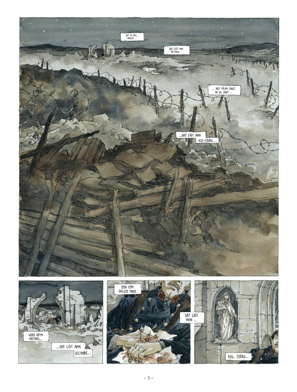 We proberen de zwanenzang van de beschaving te omschrijven: prikkeldraad, bevroren modder, bloedspetters, lichaamsdelen, bijtende rook, rondvliegende brokstukken, oorverdovende knallen, kadavers, doorweekt en verkleumd, mosterdgas dat je zal blijven proeven en ruiken,... De rauwe tekeningen van Maël (Moeder Amerika, Miltons Dromen) kunnen hier niet beter bij passen. Sergeant Fernand Desloches verwoordt het als volgt: "Ik denk dat ik buiten de oorlog niet meer functioneren kan."