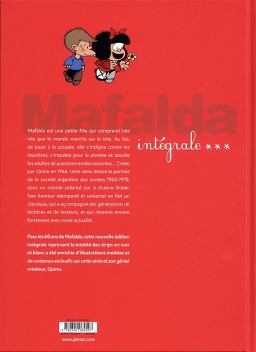 Mafalda est une petite fille qui comprend très vite que le monde marche sur la tête. Au lieu de jouer à la poupée, elle s'indigne contre les injustices, s'inquiète pour la planète et assaille les adultes de questions embarrassantes... Créée par Quino en 1964, cette série dresse le portrait de la société argentine des années 1960-1970, dans un monde polarisé par la Guerre froide. Son humour atemporel et universel en fait un classique, qui a accompagné des générations de lectrices et de lecteurs, et qui résonne encore fortement avec notre actualité.