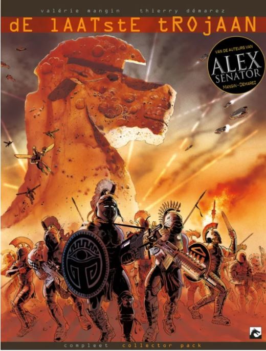 In 2005, vier jaar na het eerste deel van De Gesel Gods, publiceerde Talent de eerste twee delen van De Laatste Trojaan. Niet veel later was het liedje van de uitgeverij uitgezongen, een puinhoop van onafgewerkte series achterlatend. Met mondjesmaat pikten diverse andere, soms gloednieuwe uitgeverijen de krenten uit de pap. En elke keer juichten lezers en verzamelaars. Dat het vet nog lang niet van de soep was — we blijven bij traditionele gerechten — werd in 2012 bewezen. Toen startte Dark Dragon Books terug naar het pre-Talent-tijdperk door Het Kristallen Zwaard in een nieuw, integraal jasje te gieten. In dezelfde collectie Graphic Novel Collection verscheen tegelijk een integrale versie van De Laatste Trojaan met alle zes delen. Vier van de zes delen waren nooit in het Nederlands verschenen. Het kleinere formaat van de collectie was een obstakel voor stripliefhebbers. Nu is er deze nieuw kans met de complete reeks in zes softcoveralbums als collector pack. De Laatste Trojaan vult in veel opzichten diens voorganger De Gesel Gods aan... of overtreft die antieke galactische sf-reeks zelfs. Het speelt zich exact een millennium vóór de gebeurtenissen in De Gesel Gods af. 3305 na Christus herhaalt de 'geschiedenis' van het paard van Troje zich op de planeet Troje. Dat paard vol vijandelijke soldaten is nu een achtergelaten asteroïde in de vorm van een paardenhoofd. Van de weeromstuit moet de Trojaanse strateeg Aeneas vluchten. Een hele hoop getrouwen en zijn geliefde Creusa gaan met 'm mee. Troje wordt vernield en zijn bewoners afgeslacht. Het is nu aan Aeneas om een geschikte planeet te vinden en daar het nieuwe Rome te stichten want zo voorspelde het hem zijn moeder, de godin Venus. In de zes delen worden op Valérie Mangins geheel eigen wijze oud-Griekse mythes en Vergilius' Aeneis herverteld. Deel 1 onderricht ons over de ondergang van Troje. In deel 2 belanden de overlevenden op Thracië, de planeet van de Amazones, maar die is in een zoutplaneet veranderd. In deel 3 lijkt een onbekende planeet een paradijs te zijn door de hartelijke bevolking en de weelderige vegetatie, maar schijn bedriegt. Deel 4 verkent het concept van de spiegelwereld met een herinnering aan het machtige Carthago. Het daaropvolgende deel diept parallelle werelden uit wanneer Aeneas voorbij de dood treedt. In het laatste deel bereikt het gezelschap eindelijk de uitverkoren planeet waar het nieuwe Rome moet komen. Ruïnes, dinosauriërs en een vijandige bevolking staan hen nog in de weg. In elk van de hoofdstukken komen Griekse goden zich bemoeien. Je kan het hele lot opnoemen (Mars, Neptunus, Zeus, Diana,...) en ze kwamen wel ergens tussenbeide, om niet te zeggen dat ze het Aeneas extra lastig maakten. Dit hele spel van antieke elementen en moderne sf knettert nog meer dan in De Gesel Gods. In het hoofdstuk Carthago bijvoorbeeld zweven ruimtetuigen rond die zijn uitgerust met olifantenhoorns. Generaal Hannibal is niet ver weg. Wie daar een beetje in thuis is, beleeft dubbel zoveel pret met het lezen van De Laatste Trojaan. Voor alle andere lezers ontvouwt zch een raamvertelling, verteld door dichter Vergilius aan de nazaten van de overlevende Trojanen, zonder weerga. Met een beetje goede wil zouden de liefhebbers van Storm en De Kronieken van Pandarve hier ook hun hartje aan kunnen ophalen, alleen ontbreekt het De Laatste Trojaan wat aan het soort luchtigheid dat Storm kenmerkt. Mangin is nu eenmaal een ernstige schrijfster. Hoe dan ook biedt dit epos een extra troef dankzij het uiterst sfeervol in beeld gebracht tekenwerk — alleen al die inkleuring, jong! — van de zeer getalenteerde Thierry Démarez. In feite valt zijn Alex Senator (opnieuw op scenario van Mangin) tegen als je het album naast deze integrale legt. (SSZ)