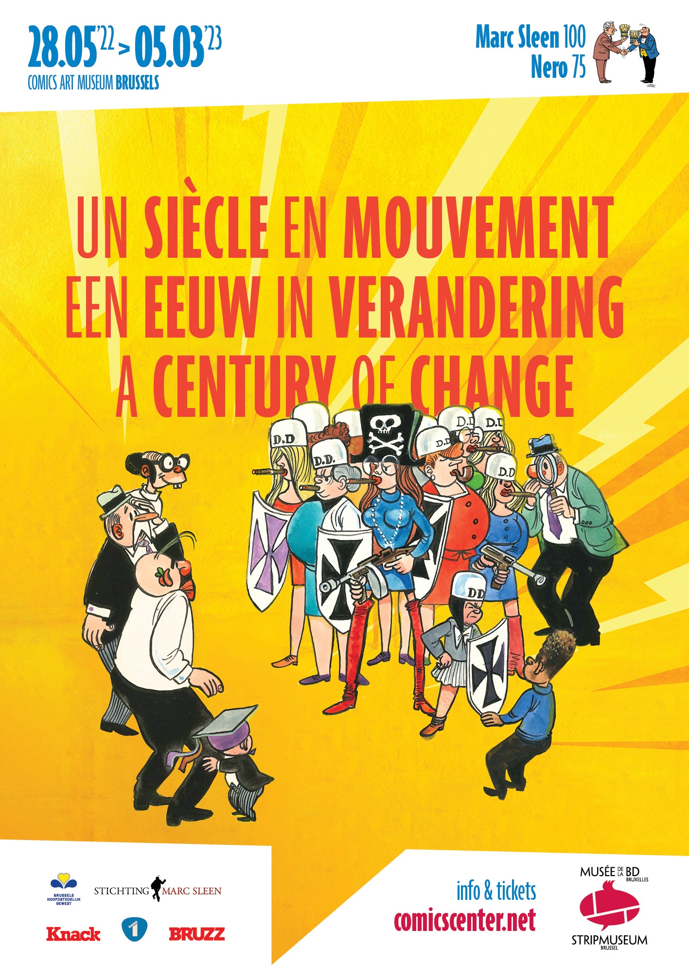Marc Sleen Catalgous Expo 1 Een Eeuw in verandering Marc Sleen (1922-2016) tekende in zijn loopbaan een heel tijdsdocument bij elkaar. Het leverde hem een plek in het Guiness World Record Book en een Ridderschap op. Maar de tijd raast genadeloos door, en wat gisteren was is vandaag niet meer. Op zijn 100ste verjaardag confronteren we het oeuvre van Sleen en het tijdsbeeld dat hij schetste met de wereld van vandaag, met wat veranderde en evolueerde en hoe beelden van vroeger soms botsen met de waarden van vandaag. Marc Sleen 100, Nero 75, Een eeuw in verandering is de catalogus van de gelijknamige tentoonstelling in het Brussels Stripmuseum. De catalogus bevat veel extra materiaal en bevat de teksten in het Nederlands, Frans en Engels.