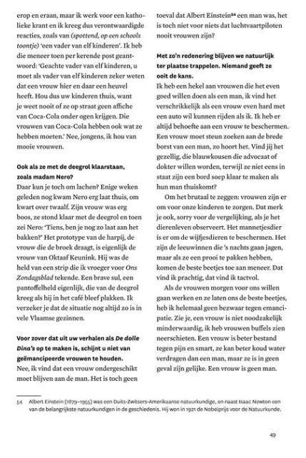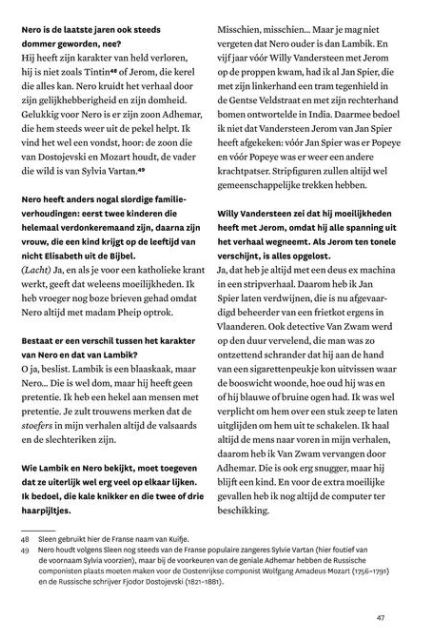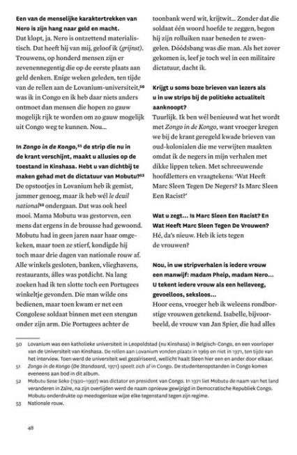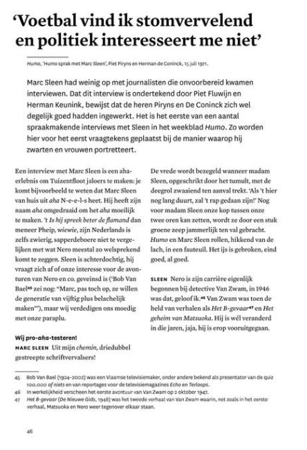 Gemiddelde score 5 / 5“Marc Sleen: de interviews” is een kolossaal hardcover naslagwerk geworden van liefst 568 pagina’s, weegt ruim 1,5 kilogram en is het resultaat van de samenwerking tussen de Uitgeverij Davidsfonds, de Stichting Marc Sleen en het Brussels Hoofdstedelijk Gewest. Op de cover prijken zeker niet toevallig een jeugdige Marc Sleen omringd door zijn geesteskinderen Nero, Adhemar, Madam & Meneer Pheip, Petoetje & Petatje, Piet Fluwijn & Bolleke, Octaaf Keunink en de Champetter van De Lustige Kapoentjes. Zij zijn door de jaren heen voor heel wat lezers cultureel striperfgoed geworden. Een aantal onder hen prijken trouwens her en der in Vlaanderen op stripmuren of hebben een eigen standbeeld gekregen. Marc Sleen werd geboren op 30 december 1922 in Gentbrugge als Marcel Honoré Nestor Neels maar was zeker niet gelukkig met zijn voornaam. “Marcel is meer de naam voor een coiffeur dan een dynamische kerel als ik. En schrijf mijn voornaam nooit met een ”k” want dat doet mij terugdenken aan die vervloekte Duitsers en mijn ellendige tijd in een concentratiekamp…” zijn maar een paar van de vele anekdotes en weetjes die je in dit lijvige boek rond Marc Ridder Sleen kan te weten komen. Wouter Adriaensen, Yves Kerremans en Noël Slangen selecteerden tekstmateriaal uit meer dan 180 interviews uit kranten, magazines, radio en televisie uit een periode van liefst 65 (!) jaar. Een aantal interviews zijn quasi volledig opgenomen maar ook citaten en markante uitspraken van Marc Sleen komen ruimschoots aan bod. Dit boek zal zowel de beginnende als de meest ervaren Sleen fan zeker kunnen bekoren. Het leest als een trein en mag eigenlijk in geen enkele (strip of andere) boekenkast ontbreken. Sleen is en blijft voor altijd één van de grootmeesters van het tekenverhaal die ons land voortbracht en die ooit het Guinness Record Book haalde. Het mag nu al duidelijk zijn dat de 100ste geboorteverjaardag in 2022 zeker niet onopgemerkt voorbij zal gaan.