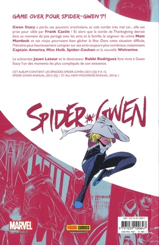 Game over pour Spider-Gwen ? ! Gwen Stacy a perdu ses pouvoirs arachnéens, et cela tombe très mal car... elle est prise pour cible par Frank Castle ! Et alors que la soirée de Thanksgiving devrait être un moment de joie partagé avec les amis et la famille, le seigneur du crime Matt Murdock et ses ninjas pourraient bien gâcher la fête. Dans cette situation difficile, l'héroïne peut heureusement compter sur ses amis toujours plus nombreux, notamment Captain America, Miss Hulk, Spider-Cochon et la nouvelle Wolverine. Le scénariste Jason Latour et le dessinateur Robbi Rodriguez font vivre à Gwen Stacy l'un des moments les plus compliqués de son existence. Cet album contient les episodes Spider-Gwen (2015 (II)) 9 A 15, Spider-Gwen Annual (2015 (II)) I et All-New Wolverine Annual (2016) I.