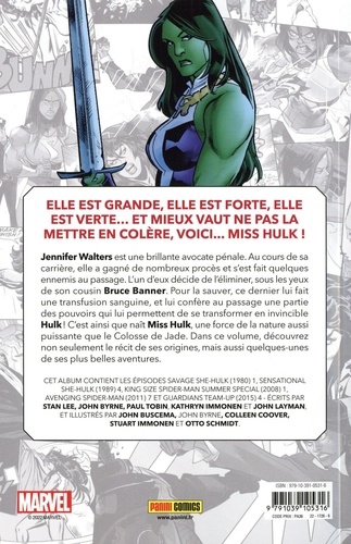 Jennifer Welters est une brillante avocate pénale. Au cours de sa carrière, elle a gagné de nombreux procès et s'est fait quelques ennemis au passage. L'un d'eux décide de l'éliminer, sous les yeux de son cousin Bruce Banner. Pour la sauver, ce dernier lui fait une transfusion sanguine, et lui confère au passage une partie des pouvoirs qui lui permettent de se transformer en invincible Hulk ! C'est ainsi que naît Miss Hulk, une force de la nature aussi puissante que le Colosse de Jade. Dans ce volume, découvrez non seulement le récit de ses origines, mais aussi quelques-unes de ses plus belles aventures.