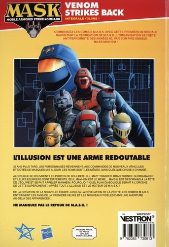 Commencez les comics M. A. S. K. avec cette première intégrale racontant la (re)création de M. A. S. K. , l'organisation secrète anti-terroriste des années 80, par son pire ennemi : Miles Mayhem ! Cette série de comics M. A. S. K. est à la fois la suite et un reboot de la série débutée 1985 par la célèbre ligne de jouets Kenner et une série animée qui aura marqué toute une génération. 35 ans plus tard, les personnages reviennent, aux commandes de nouveaux véhicules et de masques mis à jour. Les noms sont les mêmes, mais quelque chose a changé... Alors que se rouvrent les portes de Boulder Hill, Matt Trakker, Brad Turner, Gloria Baker et leurs équipiers sont différents, seul Mayhem est le même... mais il est désormais à la tête de l'équipe. Pourquoi ? Quel plan diabolique serait à l'origine de cette supercherie ? Après tout, l'illusion est le moteur de M. A. S. K. !
