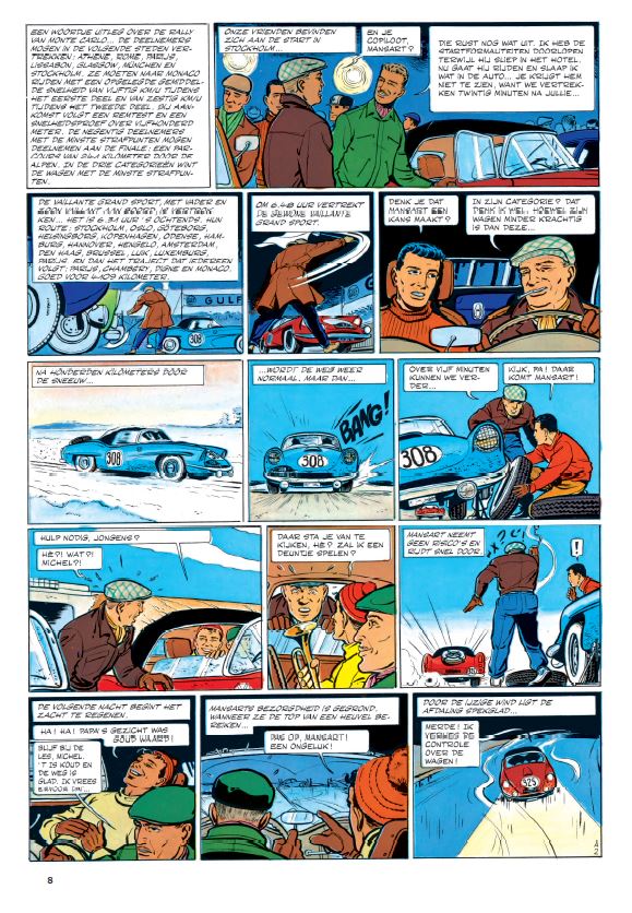 We waren sceptisch. In onze ervaring waren korte verhalen meestal opvullertjes voor speciale themanummers of pocketversies van Robbedoes, Kuifje, Pilote, Eppo of andere weekbladen. Een tussendoortje. Leuk om te lezen, maar al vergeten na vijf minuten. Gemakkelijk geldgewin ten koste van de stripliefhebbers die alles over hun held/heldin willen hebben, was dan ook de gedachte toen we dit album met oude korte verhalen van Michel Vaillant ter hand namen. Een halfuurtje later moesten we echter toegeven dat we hier de bal keihard misgeslagen hadden. Dit album is zeer verzorgd opgesteld. Niet minder dan tien korte verhalen (de meeste van vier bladzijden) en een leuk dossier over een fan (Marcel Sylvand) die honderden uren besteedde om op basis van een oud Datsun 260 Z-chassis erin slaagde om een adembenemend mooie blauwe Vaillante Le Mans GT na te bouwen. Respect! Vijf korte verhalen zetten nogmaals de gekende karaktertrekken van Michel in de verf: camaraderie, onverzettelijkheid, edelmoedigheid,... We krijgen ook een niet vertaald verhaal gesponsord door schoenen Garbel en een verhaal over een ouder wordende racepiloot die door Michel met de voeten op de grond gezet wordt. Tot slot is er ook het twaalf bladzijden lange Zijn Mooiste Overwinning waarin Michel, deelnemend aan Le Mans, verneemt dat zijn zoon Patrick geboren is. Beetje klef, maar Jacky Ickx in de Martini Porsche is van de partij en dat maakt alles goed. Dus: waar voor je geld en met een diepe VROOAAR kijken we uit naar deel 2, Seventies. JOHAN DECLOEDT ( bron SSZ)