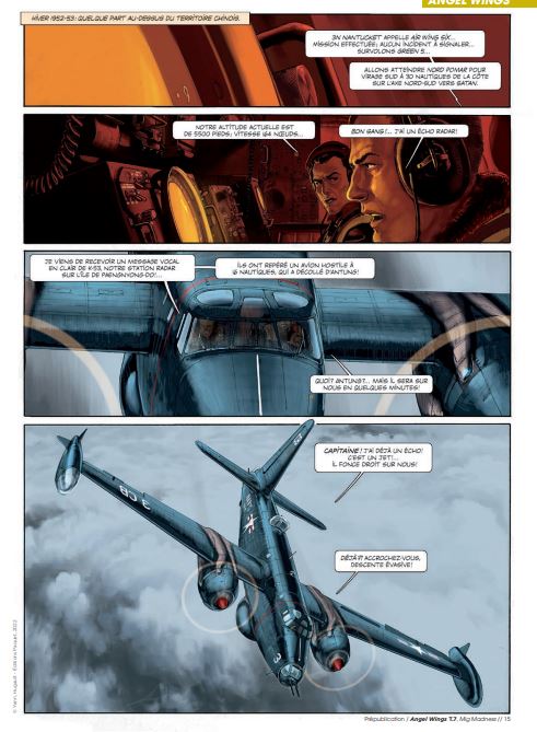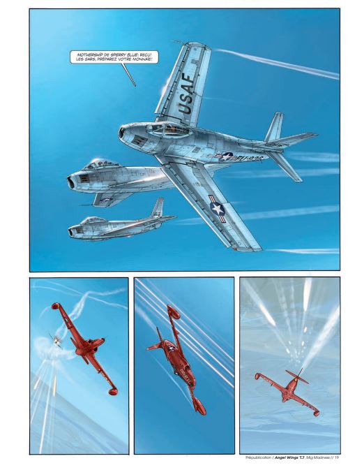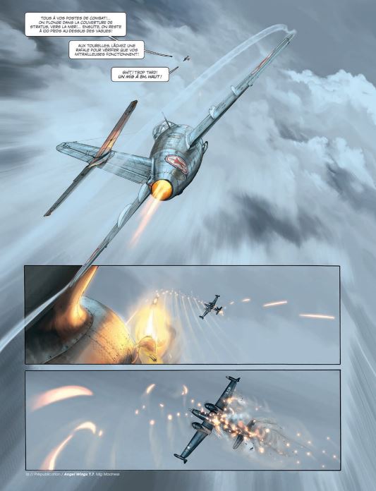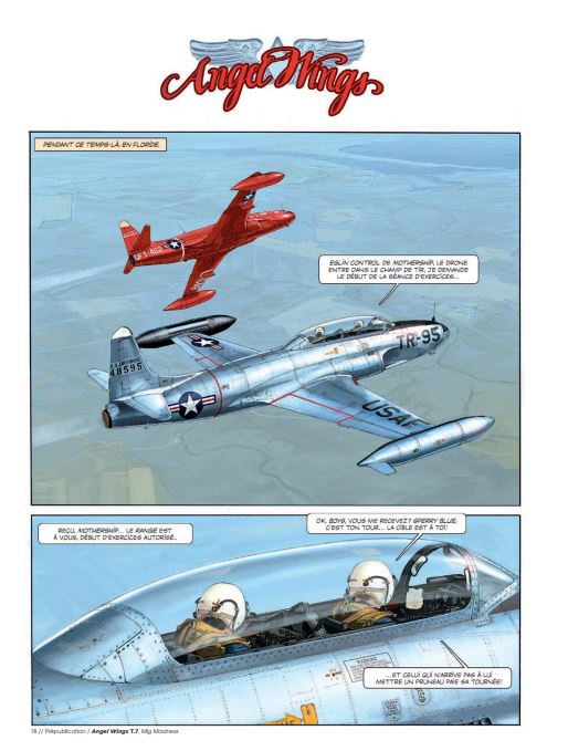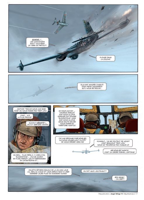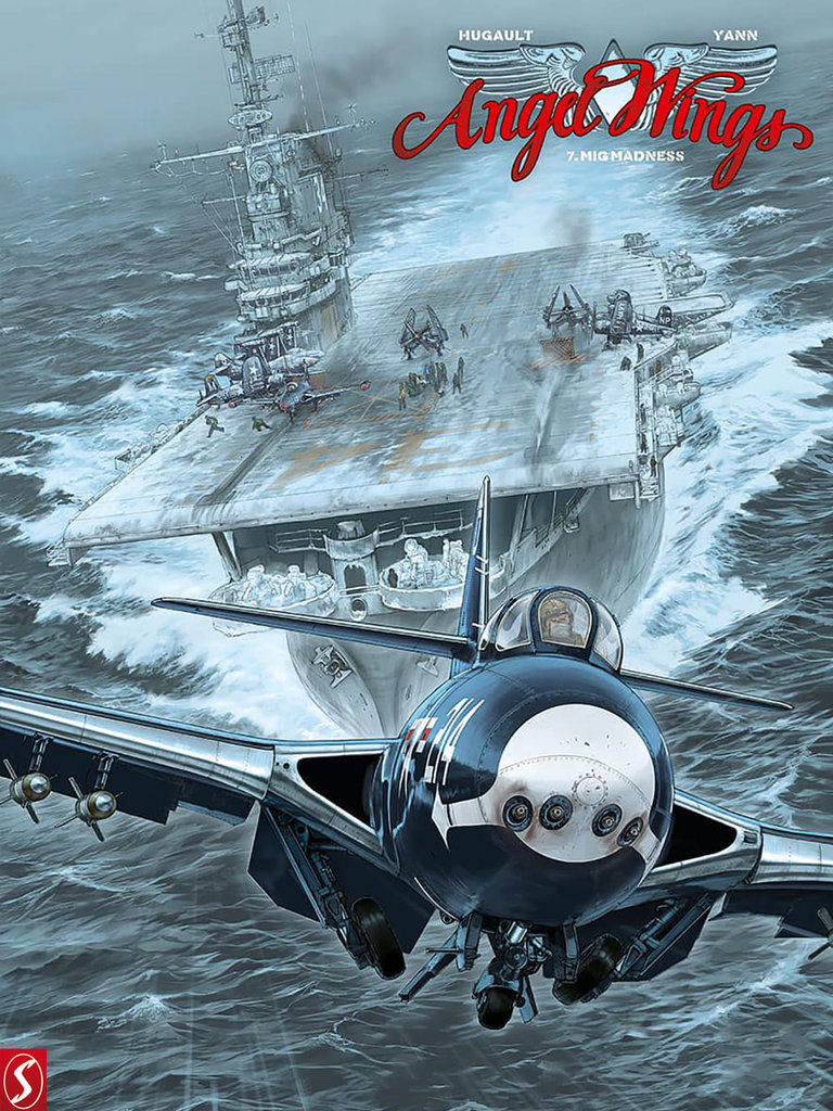 Gemiddelde score 3 / 5Madness op het laatst Het hoogtepunt van dit zevende deel? De tekening op de laatste bladzijde. Op de andere 47 bladzijden lezen we hoe Angela McCloud is gedegradeerd tot dronepiloot om zo jonge officieren op te leiden op de luchtmachtbasis in Florida. Haar geliefde Rob is werkzaam als piloot op een vliegdekschip wdat patrouilleert in de Zuid-Chinese Zee. Wat zijn werk extra gevaarlijk maakt, is dat de Russische Mig-straaljagers beter zijn dan de Amerikaanse straaljagers. Alsof dat niet genoeg is, stort er op vijandelijk terrein een Amerikaans spionagetoestel neer dat niet in verkeerde handen mag vallen. Rob wordt erop uitgestuurd om het toestel te vernietigen. De eerste cyclus speelde zich af in Birma, de tweede in de Pacific en nu is het Koreaans schiereiland de locatie van de avonturen van miss McCloud. Scenarist Yann en tekenaar Romain Hugault hebben besloten om hierna nog één album te maken van Angel Wings en dan vliegen ze naar een nieuwe horizon. Hugault is bij uitstek een luchtvaarttekenaar en op dit moment wellicht ook de beste die er rondvliegt. Grafisch is ook deze Angel Wings weer genieten en sommige scènes zijn gewoon top qua bladschikking, inkleuring en details. Het verhaal van Yann is niet het meest pakkende, nergens wordt het echt spannend en voor je het weet ben je al op de laatste bladzijde. Koop en blader het album snel door, want die eindscène zullen veel mensen zeker herkennen. bron SSZ
