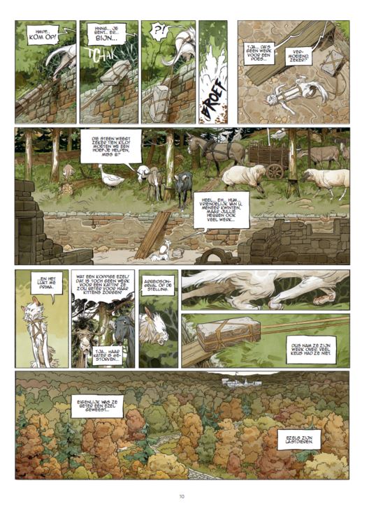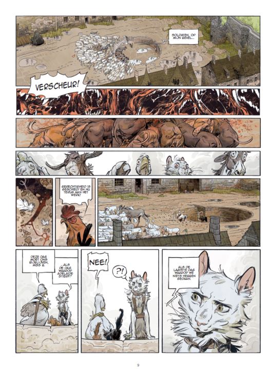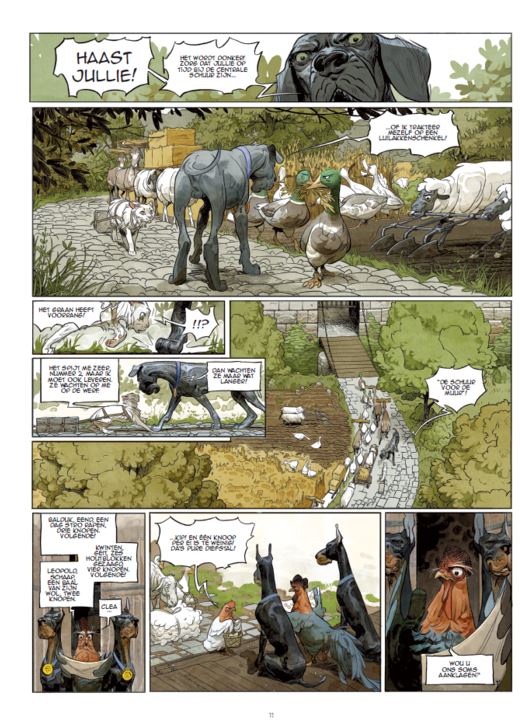 Een dierenstrip, ja maar niet zomaar een dierenstrip. Een strip gebaseerd op het thema “geweldloos verzet “ die Dorisson terug vond bij Ghandi, Srdja Popovic ( de man die aan de basis lag van de val van Milosevic) en het boek “ La Désobeissance Civile “ van H.D.Thoreau uit 1849. Uiteraard is een vergelijk met de Boerderij der dieren van George Orwell, niet ver weg en is de inspiratie daar ontstaan. Toch wil de strip de frustratie van dit boek verwerken, namelijk “een revolutie die is geboren met goede gevoelens en geweld eindigt meestal door een dictatuur erger dan degene die ze wilde bestrijden”. Door dieren te gebruiken in dit verhaal, die een universele draagkracht hebben, kunnen zware en vreselijke gebeurtenissen verteld worden met een vleugje humor. Het verhaal gaat dus vooral over de leven onder een dictatuur, in dit geval “Silvio” de stier die over het kasteel heerst samen met zijn waakhonden en zwijnen. Alle thema’s ( Corruptie, wraak, opstand, onrecht, geweld, frustratie,…) komen hier aan bod op een bijzonder originele manier en vooral door zeer charmante personages zoals bv Miss Bengalore de kat. U leest het al, niet zomaar een strip, Dorisson wil de lezer vooral attent maken dat geweld, zelfs uitgelokt, een slechte raadgever is en meestal leidt tot meer geweld. Niet moraliserend doch steeds reflecterend naar een goede democratie en een beschermende, sociale maatschappij laat Dorisson de lezer nadenken over onze samenleving en hoe het er in de wereld aan toe gaat. Tekenaar Felix Delep levert hier zijn debuut én wat voor één. Dorisson vroeg aan Casterman om een tekenaar in de stijl van Milt Kahl en een vriend zei hem om eens een kijkje te nemen op de site van Felix en daar was de keuze vlug gemaakt. WAT EEN TALENT! Zijn tekenstijl is bijzonder vloeiend, met zin voor detail, warm en doet soms denken aan Guarnido. Felix is 25 jaar en ondertussen reeds gestart aan deel 2. Deel 1 nam wat meer tijd in beslag door het zoeken naar de juiste manier van tekenen. Het verhaal zal uit 4 delen bestaan en is reeds volledig geschreven. Een strip die uiterst doordacht en origineel is, zeker een topper in wording. Verschijnt in Hardcover en softcover (72 blz.). Ergens in Frankrijk tussen de twee wereldoorlogen, genesteld in het hart van een boerderij vergeten door mensen, wordt het dierenkasteel geleid door een ijzeren schoen door president Silvio ... gedetacheerd door een hondenmilitie, de dictator stier exploiteert de andere dieren, allemaal gedwongen om uitputtende inspanningen te leveren voor het welzijn van de gemeenschap ... Miss Bangalore, angstige kat die alleen probeert haar twee kleintjes te beschermen, en Caesar, een konijn gigolo, gaan samenspannen met de wijze en mysterieuze Azelar, een brilrat om weerstand tegen onrecht te bepleiten, strijd tegen hoektanden en klauwen door ongehoorzaamheid en gelach ... Eerste deel van een serie gepland in vier delen, De Animal Castle bezoekt de Farm Animals van George Orwell (1945) opnieuw en nodigt ons uit voor een veelheid aan reflecties, soms zeer actueel ...