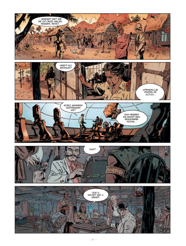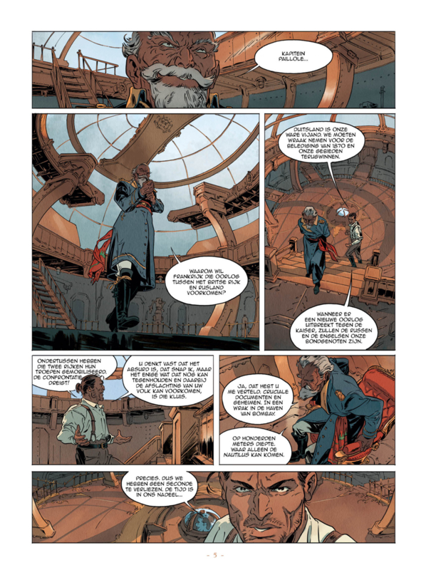Als Jules Verne James Bond had geschreven ... Van Ierse afkomst, maar opgegroeid in India voordat hij de protégé van een kolonel van de kroon werd, is Kimball O'Hara een Britse geheime dienstagent aan het einde van de 19e eeuw. Zijn intelligentie, zijn uitstekende fysieke conditie en zijn morele oprechtheid maken hem tot een kostbaar element. Maar op een avond in het jaar 1899 in Bombay werd zijn lot op zijn kop gezet... Het spinnen van een Russische agent leidt hem op een Engels regeringsschip midden in een officieel feest wanneer daar plotseling een bom ontploft, de romp van het schip verbrijzelt en veel van de aanwezige hoogwaardigheidsbekleders om het leven komt. We schreeuwen om de aanval en een zeer aangewezen boosdoener dringt zich op in de ogen van iedereen: Kimball O'Hara. Om zijn onschuld te bewijzen, diplomatieke spanningen te bezweren en te hopen dat hij zijn zoon ooit weer zal zien, zal Kim geheime documenten moeten terugvinden die zijn achtergelaten in het wrak van de boot die op de bodem van de baai is gevallen. Helaas kan geen mens zo diep de zeebodem in. Geen, behalve misschien één! Tien jaar geleden verdween hij van de aardbodem, maar het gerucht gaat dat hij een gevangene van de Russen was, vast in een ontoegankelijk fort midden in een Siberische ijswoestijn. Deze man is kapitein Nemo. Op de vlucht voor de Indiase autoriteiten gaat Kim op zoek naar dit legendarische personage dat de meest succesvolle onderzeeër aller tijden bezit: de Nautilus ... Een wereldwijde achtervolging, Nautilus is een verhaal van actie, spionage en avontuur, rijk aan complexe personages, onlosmakelijke situaties en spectaculaire scènes. Wanneer de dood op elk moment kan intreden en de spanning onder alle omstandigheden op zijn hoogtepunt is, zijn er drie oplossingen: sluwheid, vlucht of geweld . Striptekenaar Grabowski, Guénaël ( °1987, Frankrijk), is een striptekenaar geboren in La Rochelle in 1987. Na het behalen van een literair baccalaureaat ging hij naar de tekenschool Pivaut in Nantes. Daar ontmoette hij Thimothée Montaigne, destijds zijn leraar. Deze besluit hem onder zijn hoede te nemen, hij vervolgt zijn opleiding buiten de cursussen en biedt hem in het bijzonder de kans om te werken aan het tweede deel van ' Malicorne ' waarin Guénaël de decors en het inkten realiseert. Helaas stopte de uitgever het album en zag het boek nooit het daglicht. Later biedt Mathieu Mariolle, die deel uitmaakt van zijn eindexamenjury, hem aan om Nautilus te tekenen, zijn eerste soloalbum. Woont in Charente-Maritime. Stripscenarist Mathieu Mariolle (°1978, Frankrijk) schreef volgende stripreeksen of delen hiervan = • Hitlers Laatste Geheim • Blue Note • De hand van de Duivel • De nautilius • De Weg van het Zwaard • Sjanghai • Thogal Kris van Valnor • William Adams • > Zij Schreven geschiedenis