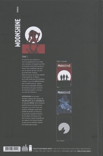 Tome 2. En prenant leurs distances avec les Appalaches et la mafia new-yorkaise, le torpedo Lou Pirlo et sa petite amie Dalia pensaient laisser leurs problèmes derrière eux et repartir de zéro, du côté de la Nouvelle-Orléans. Mais les ennuis sont d'une fidélité à toute épreuve, et depuis qu'il a été mordu par une terrifiante créature, Lou n'est définitivement plus le même homme. Traqué par le plus redoutable chasseur de monstres du pays, l'instinct de l'animal prendra-t-il le pas sur celui de l'homme ? Moonshine est la toute dernière création des auteurs de 100 Bullets, Brian AZZARELLO et Eduardo RISSO, dont l'alchimie parfaite donne une fois encore naissance à un récit d'une rare maîtrise. Mélange savamment distillé de thriller et d'horreur, on pourrait conseiller la lecture de cet album à la faveur d'un clair de lune, l'esprit échauffé par les vapeurs d'un alcool trouble, et bercé par la mélodie redneck d'un banjo désaccordé...