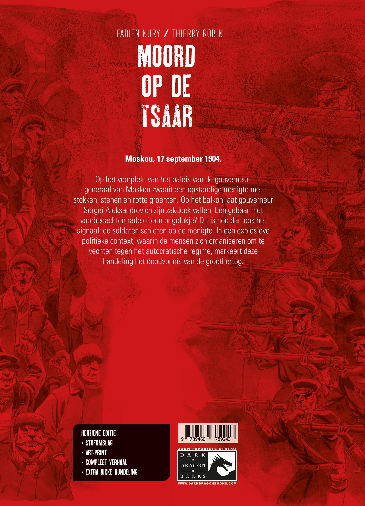 Herziene editie met stofomslag & Art-Print 1905. De Russische revoluties ontkiemen, het tsaristische Rusland neemt af. In deze context van extreme politieke en sociale spanningen doet een ogenschijnlijk onschuldig gebaar van gouverneur Sergei Alexandrovich het poeder ontsteken en tekent hij zijn doodvonnis. Georgi, een terrorist, zal er alles aan doen om hem uit te schakelen. Dit is het verhaal dat wordt verteld door Moord op de Tsar die in Frankrijk in in een tweeluik verscheen waarin achtereenvolgens de twee standpunten worden uiteengezet, die van het slachtoffer (deel 1) en zijn huurmoordenaar (deel 2). Fabien Nury en Thierry Robin hebben deze gedissocieerde verhalen 'samengesteld' en bieden een nieuwe spiegellezing, intiemer en met elkaar verweven voor een meedogenloze en ongekende politieke thriller!