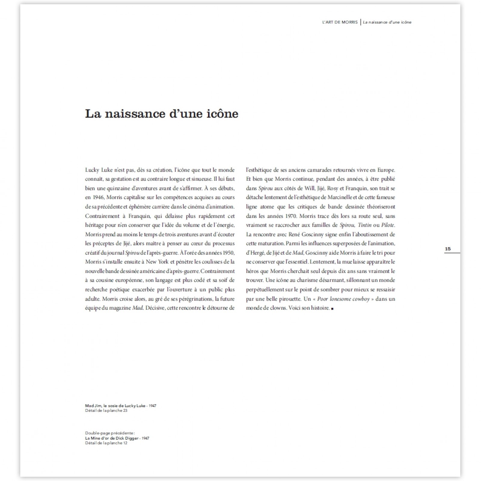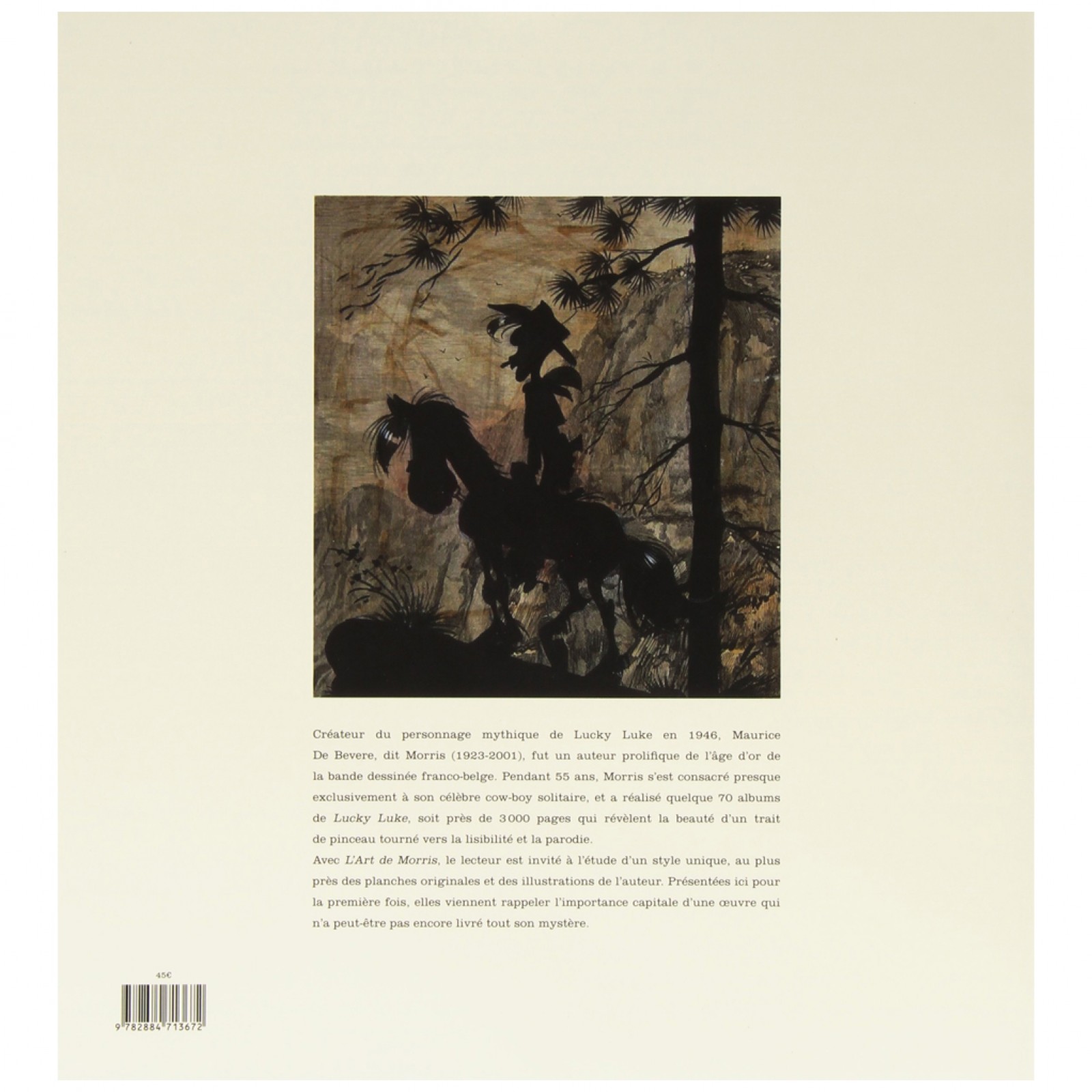 In december 1946 publiceerde Maurice de Bevere, bekend als 'Morris', het eerste avontuur van Lucky Luke in L'Almanach Robbedoes: Arizona 1880. Het populaire succes was zo groot dat de maker snel plaats maakte voor zijn creatie. Kwestie van bescheidenheid ongetwijfeld. En toch... Morris is een puur genie van de 9e kunst: hij verzint een vertelling van de actie, met een uniek gevoel voor enscenering. Zijn esthetiek grenst aan het uitzonderlijke. Het werd hoog tijd om een (heel mooie) tentoonstelling aan hem te wijden, en een prachtig boek.