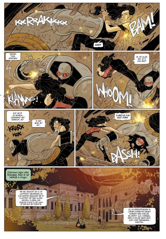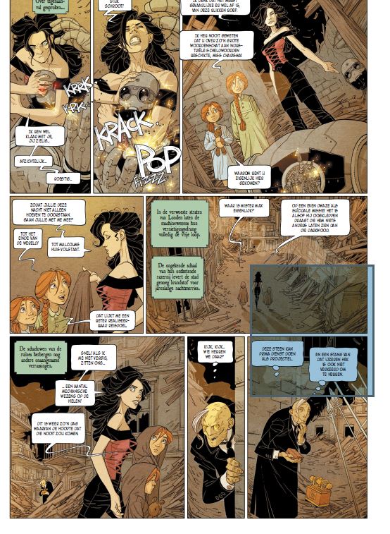 Gemiddelde score 4 / 5Eine Entdeckung! Je hebt van die strips die net onder de radar blijven. Net niet die geweldige cover. Net niet genoeg stripbudget. Net niet genoeg positieve buzz. Net niet... Malcolm Max was voor ons zo’n serie. En nu is er een derde deel, het slotdeel van de eerste trilogie, en klopt het plaatje wel. Plots gaan we toch overstag, en nemen we de hele reeks mee uit onze stripspeciaalzaak. Het allereerste prentje opent met drie knoerten van beschrijvende tekstballonnen. “London. Anno 1889. Het is zo’n nacht die typisch is voor deze metropool. Somber, nevelig, niet bepaald vrolijk stemmend. Uit de pikdonkere wolken miezert het met een ijzige regelmaat. Objectief gesproken is er niets in dit hart van het Britse rijk dat iemand uit zijn geestelijk evenwicht zou moeten halen. Niet de vage nachtschaduwen, niet het monotone gekabbel van de Theems, en ook niet het geritsel van de talloze dorre bladeren waarmee de oevers zijn bezaaid. Of het zou deze voor anker liggende schoener moeten zijn, met zijn naargeestige lading. De ruimen zijn barstensvol gevuld met levenloze lichamen, die alleen de wormen nog als voedsel en schuilplaats dienen”. WTF? Wat. Is. Dit? De toon is meteen gezet. We zetten ons wat rechter in de zetel. Al snel worden we meegesleurd in een victoriaanse detectivestrip met flarden steampunk, spookvrouwen, levende machines en Jack The Ripper-toestanden. Dit alles met een geweldig heldenduo, namelijk de ravisante halfvampier (jaja) Charisma Myskina en de enigmatische charmeur Malcolm Max, die niet toevallig in de buurt is van ene S. Holmes woont. Alles, ja alles, wat je kan linken met het Londen van de flikkerende gaslampen komt aan bod. Erg origineel is de inhoud niet, maar de vorm is het des te meer. Scenarist Peter Menningen, die nog Duitse Bessy’s heeft geschreven, hanteert een toontje dat we enkel kennen van de Jules Verne-pastiche Docteur Mystère. Het duurde even voor we erin kwamen, maar het is machtig. De volle drie delen genieten we van de barokke humor en de hoogdravende dialogen die al even snel weer onderuitgehaald worden. Of wat dacht je van deze? Malcolm: Ik ben bang dat Leech’ tekortkomingen verder gaan dan alleen een gebrek aan manieren. Hij lijdt aan obsessies die het fanatisme ver overschrijden.” Charisma: “Wat wil dat zeggen?” Malcolm: ”Ergens daarbuiten loopt een gevaarlijke gek rond.” Kijk, dat is pure geneugte ende heerlijkheid. Een dikke duim voor vertaler Ben Kamphuis om de juiste balans te vinden tussen de Duitse Gründlichkeit en de Britse tongue-in-cheek! Het literair enthousiasme zet zich naadloos verder in de tekeningen. De Duitser Ingo Römling (Star Wars Rebels) gooit zich in bijna elk plaatje. Zijn zwierige camerastandpunten contrasteren lekker met de stijfdeftige victoriaanse setting. Het totaalplaatje klopt. Dit is echt volop genieten. Malcolm Max is in alles zo over the top dat het de meest zonnige glimlach op ons gezicht tovert. Ideale vakantielectuur. SSZ"