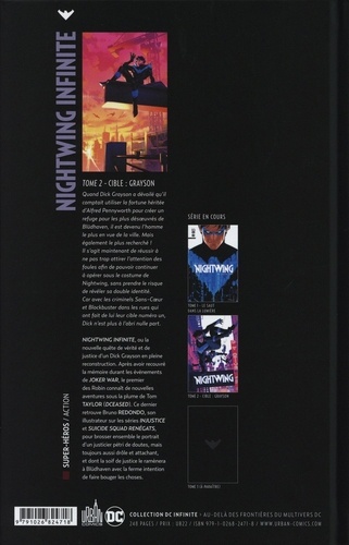 A présent que le milliardaire Dick Grayson a dévoilé qu'il comptait utiliser sa fortune, héritée d'Alfred Pennyworth, pour faire de Blüdhaven une ville plus sûre, il est devenu l'homme le plus en vue de la ville. Mais également le plus recherché ! Il s'agit maintenant de réussir à ne pas trop attirer l'attention des foules, qu'il puisse continuer à opérer sous le costume de Nightwing sans prendre le risque de révéler sa double identité. Car avec les criminels Sans-Coeur et Blockbuster dans les rues, qui en ont fait leur cible numéro un, la ville a plus que jamais besoin de son justicier masqué !