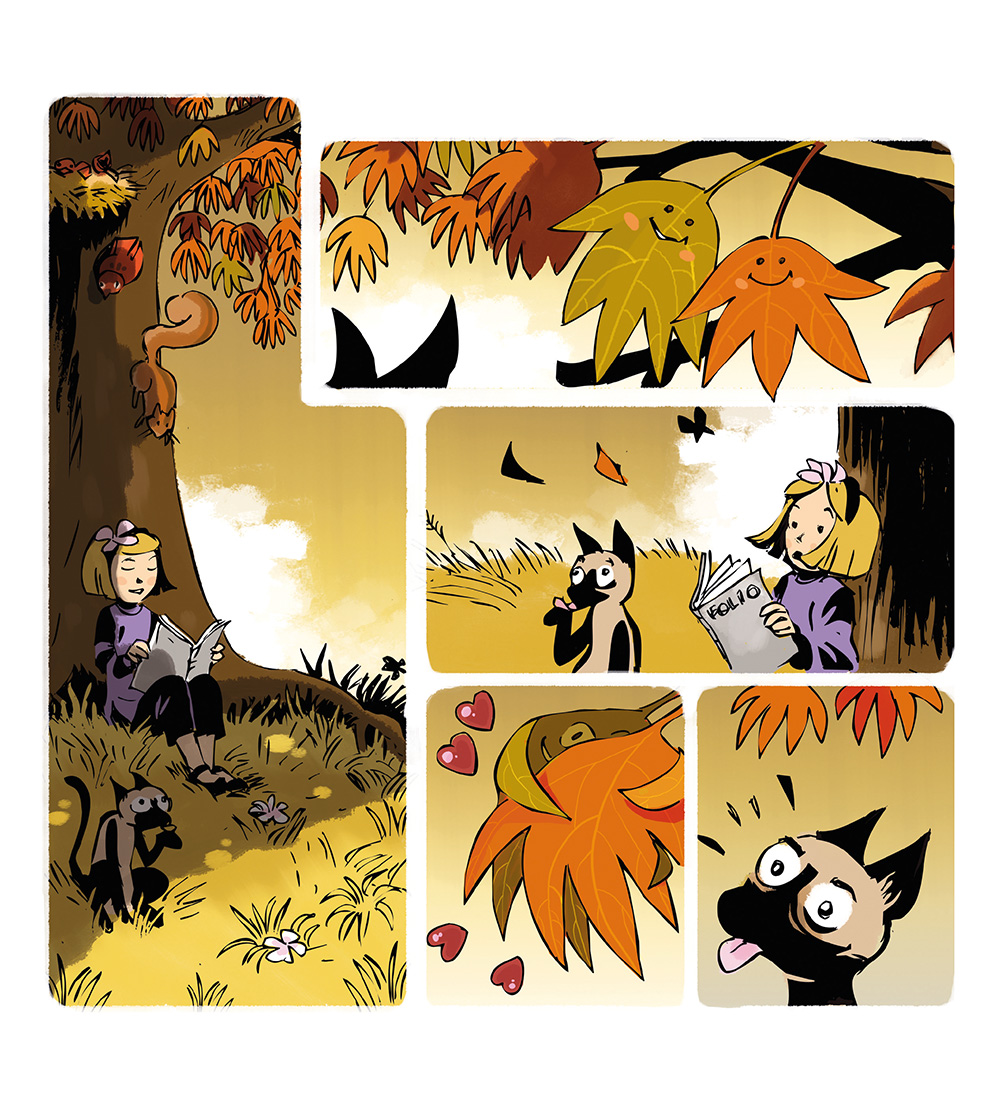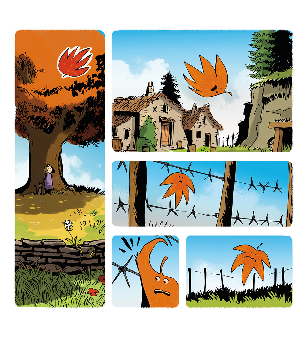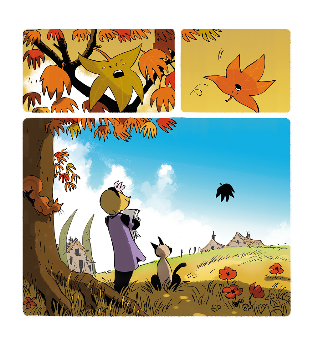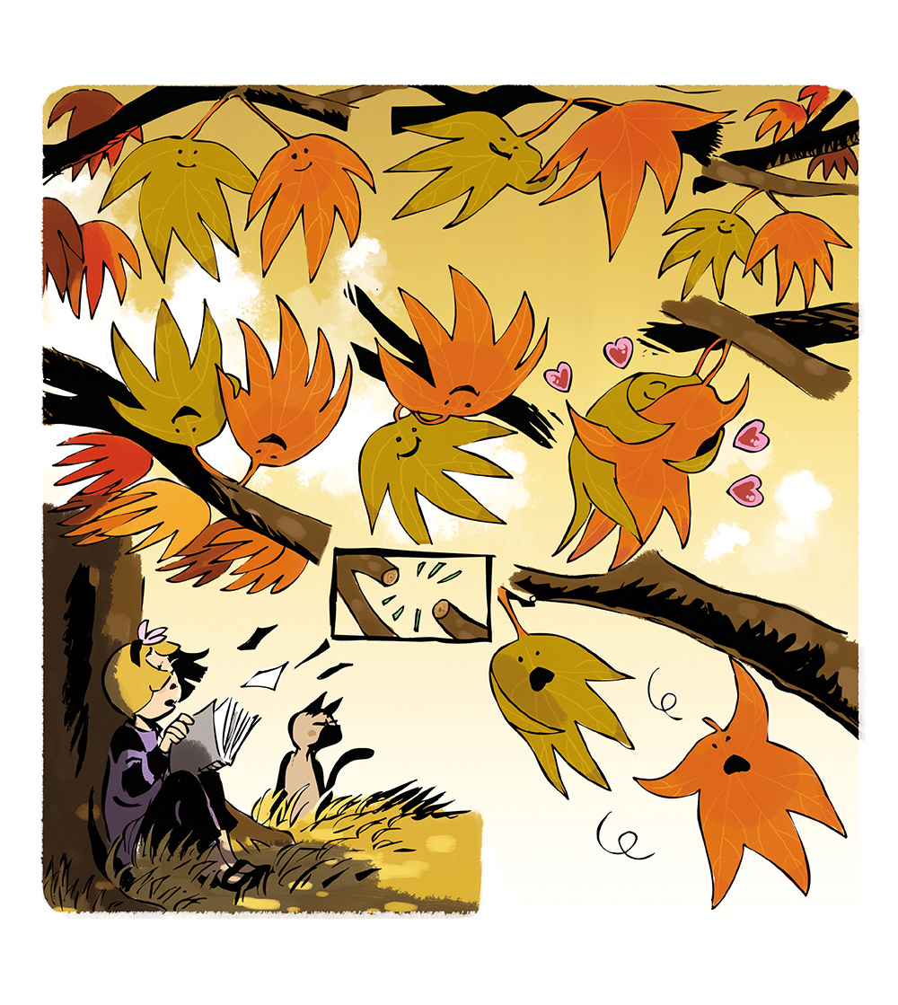 Aan het einde van de zomer wandelen Liloe en haar kat Friemel door de natuur, die dommelt onder een zacht briesje. Plotseling steekt de herfstwind op en scheidt een stelletje verliefde blaadjes, die samen wiegden aan het uiteinde van hun tak...