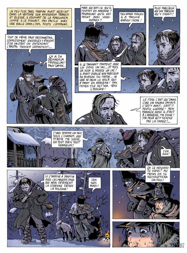 In het besneeuwde landschap wordt een jonge trommelaar van het Grande Armée, die de bijnaam ‘Hazenpad’ gekregen heeft, door de bossen achtervolgd door twee soldaten. Ze gedragen zich erg gewelddadig en schieten de jongen uiteindelijk neer. Ze lijken uit te zijn op een tas die het kind bij zich draagt. De inhoud is duidelijk kostbaar en hij is niet bereid er zonder slag of stoot afstand van te doen. Hij wordt op het nippertje gered door een roedel wolven, die het op zijn achtervolgers voorzien heeft, en weet de rest van het terugtrekkende leger weer te bereiken, waar Fanfa de Morel, een wasvrouw die het leger van Napoleon volgt, zich over hem ontfermt.