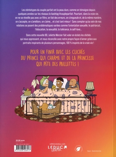 Les stéréotypes du couple parfait ont la peau dure, comme en témoigne depuis quelques années sur les réseaux le hashtag #coupleparfait. Pourtant, dans la vraie vie, on ne se réveille pas avec un filtre, on fait des erreurs, on s'engueule et, de la même manière, on s'accepte, on s'améliore, on s'aime... et c'est tant mieux ! Sans compter qu'au sein de nos relations se posent des problématiques variées comme l'orientation sexuelle, le patriarcat, l'éducation, la sexualité, la tolérance, le self-love... Dans cette nouvelle BD, Juliette Mercier fait voler en éclats les clichés qui nous oppressent, et nous réconcilie avec notre propre façon d'aimer grâce aux portraits inspirants de plusieurs personnages, 100 % inspirés de la vraie vie ! POUR EN FINIR AVEC LES CLICHES DU PRINCE QUI CHARME ET DE LA PRINCESSE QUI PETE DES PAILLETTES ! Juliette Mercier dessine depuis qu'elle est toute petite. Atteinte de la maladie de Crohn depuis ses 16 ans, elle partage sur son compte Instagram son quotidien en tant que stomisée, c'est-à-dire porteuse d'une poche de stomie, mais aussi des anecdotes humoristiques sur sa vie de couple, celle de ses ami. e. s, de sa famille ou de son chien ! Parce que Instagram peut être très complexant, elle s'engage pour briser les clichés et revaloriser l'authenticité de la vie sans filtre. Elle est déjà l'autrice de Ma Crohn de vie aux éditions Leduc graphic. @stomiebusy
