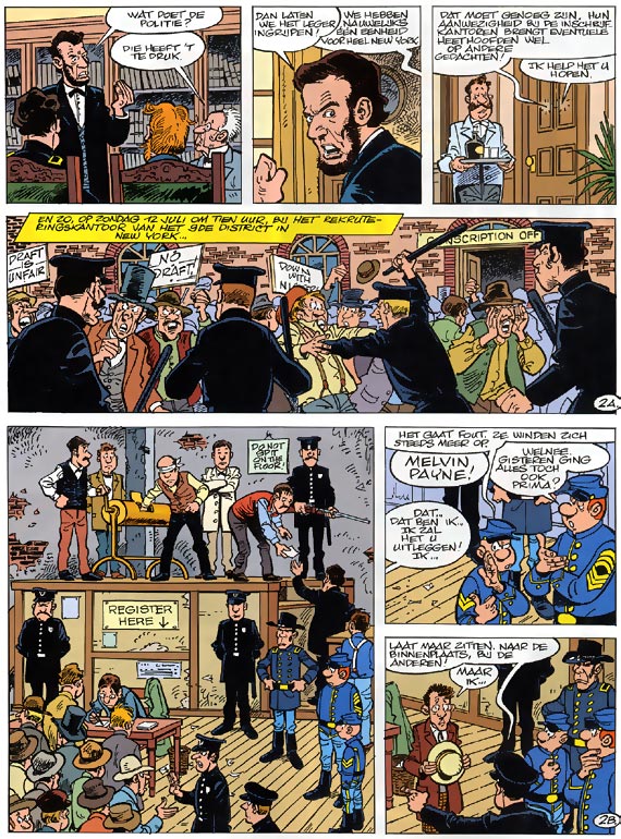 Herdruk Als het leger manschappen te kort komt en de vrijwilligers niet meer staan te dringen om tot kanonnenvlees gepromoveerd te worden, wat moet er dan gebeuren om de uitgedunde gelederen aan te vullen? Dienstplicht! Maar overal in het land komt men in opstand tegen deze impopulaire maatregel. De blauwbloezen worden naar New York gestuurd om een oogje in het zeil te houden. Maar wanneer blijkt dat de rijken zich kunnen vrijkopen, nemen de arme dienstplichtigen hun toevlucht tot geweld. Op dat moment wordt het voor onze vrienden tijd om naar het andere kamp over te lopen, als ze het einde van dit avontuur tenminste levend willen meemaken ...