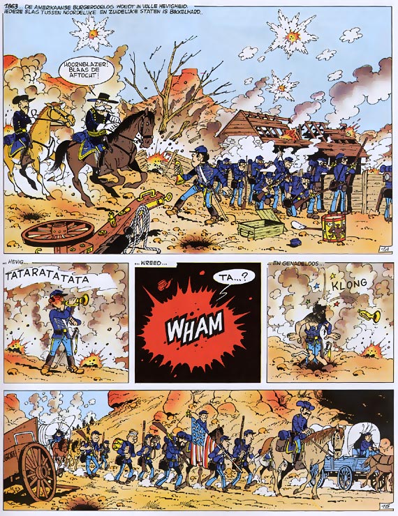 De reeks 'De Blauwbloezen' is een geslaagde mengeling van avontuur en humor. Cauvin gebruikt - zoals hij wel meer doet - historische anekdotes uit de Amerikaanse burgeroorlog om ons hilarische verhalen te vertellen over de perikelen in het leger, waar de hoogste officieren niet per se de slimste zijn... Willy Lambil heeft zich uitstekend gedocumenteerd en maakt van zijn pagina's heldere, intelligente kunstwerkjes. Het resultaat is amusement op hoog niveau, dat door een nog steeds groeiend publiek wordt gewaardeerd.