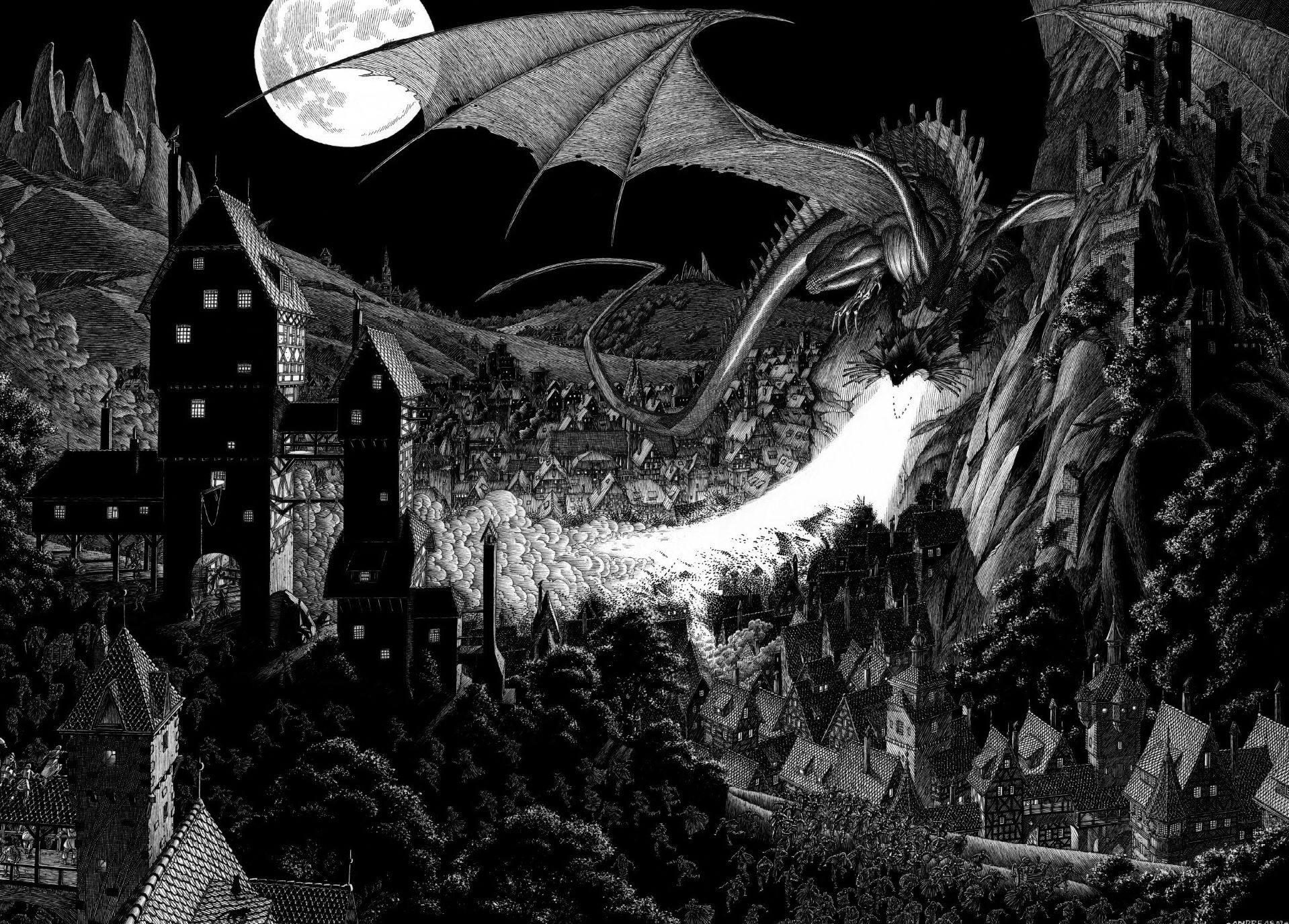 Zeer gedetailleerde tekening die Andreas ooit maakte voor L'univers des dragons, nu uitgevoerd als legpuzzel in 1000 stukjes. Ongetwijfeld Andreas’ mooiste illustratie ooit, een indrukwekkende fantasy-prent in de gravureachtige stijl van Cromwell Stone.