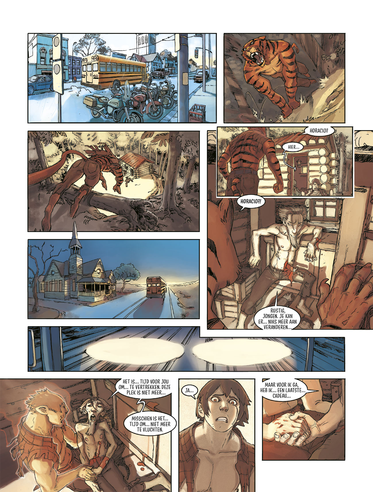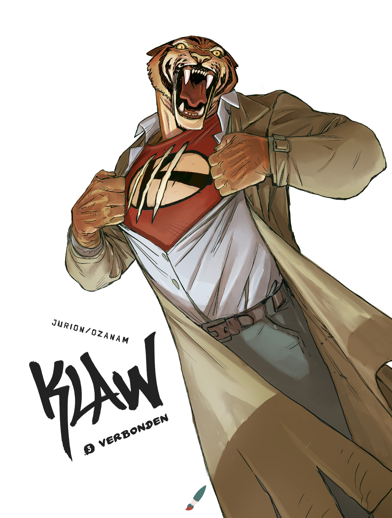 Gemiddelde score 4 / 5Klaw is een nieuwe reeks onder Diedeldus, de jeugdsectie van Daedalus. De cover laat echter een meer volwassen look uitschijnen. Dit wordt ook doorgetrokken in het scenario. Angelo ontdekt in de vorige 2 delen dat hij over buitengewone krachten à la Hulk beschikt. Hij transformeert namelijk in een diervorm als hij zich bedreigd voelt; dit wordt een dizhi genoemd. Angelo komt er ook achter dat zijn vader de spil is van een groot opgezet maffianetwerk. Hier gaat hij echter niet akkoord mee en verzet zich. Intussen zijn we 7 jaar verder en keert Angelo terug naar zijn thuisstad, Chicago. Op de terugweg naar Chicago herbeleeft Angelo een flashback waarbij hij zijn vriend Horacio half dood terugvindt. Als Horacio de geest geeft, neemt Angelo de dizhikrachten van Horacio over. Hierdoor kan hij ook de gedaante van Horacio overnemen. Eens in Chicago gebruikt Angelo zijn superkrachten vermomd als ‘the Klaw’ en bestrijdt hij zo de lokale misdaad. Zo stuit hij al snel op zijn familie die hem liever kwijt dan rijk is. Als Angelo op een avond naar het ouderlijke huis terugkeert, wordt hij overmeesterd door een oude inspecteur die op jacht is naar hem. Weet Angelo te ontsnappen? En wat met zijn vriendin Lisa, kan hij terug haar hart veroveren ? Zoals je merkt, zijn er behoorlijk wat tijdsprongen en evoluties in het verhaal. Stripscenarist Ozanam (Bad Reputation) weet zo alles boeiend te houden, hoewel het soms iets te veel wordt. Voor een jeugdstrip zijn er dan ook heel wat personages en plotwendingen om bij te houden. De superkrachten weten uiteraard aan te spreken, alsook de bad guy in dit verhaal die veel weg heeft van Iron man. Leuk is ook dat het hoofdpersonage in ieder verhaal iets ouder wordt weergegeven. Dit alles wordt knap in beeld gebracht door Joël Jurion (Anachron), die de dieren sierlijk laat voort bewegen en de actie van de strip doet spatten. Ook speelt hij met veel verschillende perspectieven waardoor het altijd anders oogt. Samengevat is dit een reeks die zeker ook door volwassenen gesmaakt kan worden en zich niet alleen richt op een jeugdig publiek. Weet een mix van Marvel-actie en manga-invloeden je te bekoren, dan kom je met deze reeks zeker aan je trekken!