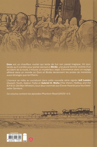 Dom est un chauffeur routier qui tente de fuir son passé tragique. Un jour, tandis qu'il s'arrête pour porter secours à Birdie, une jeune femme victime d'un accident de la route, il trouve un mystérieux objet. Commence alors un voyage effréné dans un monde où Dom et Birdie deviennent les proies de monstres aussi étranges que terrifiants. L'horreur se mêle au surnaturel dans cette nouvelle série signée Jeff Lemire (Sweeth Tooth, Gideon Falls) et Gabriel H. Walta (The Vision, Hellboy and the B.P.R.D : Old Man Whittier), tous deux nommés aux Eisner Awards pour leur bestseller Sentient. Ce volume contient les épisodes Phantom Road (2023) 1 à 5.