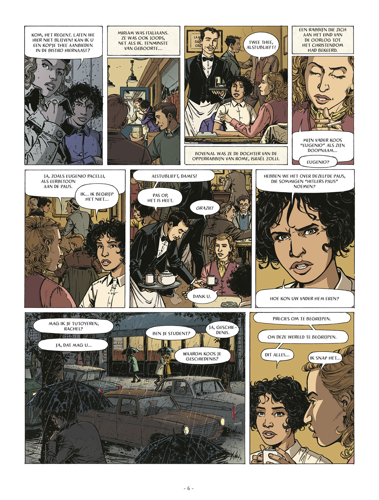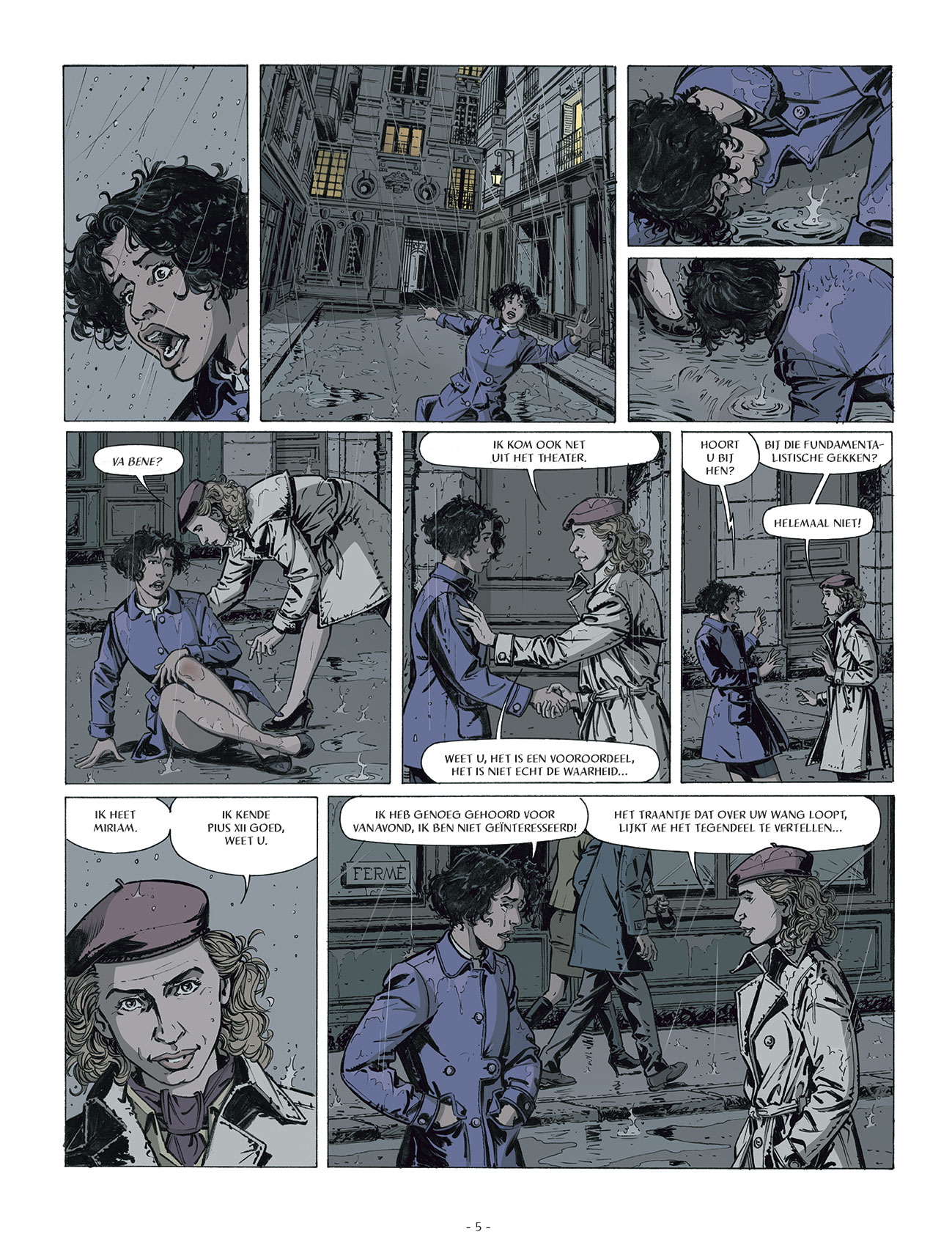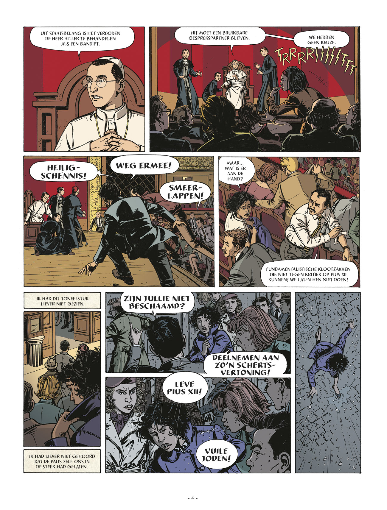 Nieuw verhaal over een historische paus, in dit geval Pius XII (1876-1958), die tijdens de opkomst van het nazisme regeerde. Het verhaal in twee delen volgt de achtergrond van de paus die zich diplomatisch moest opstellen. “Door oorlog kan alles verloren gaan! »Parijs, 12 december 1963. Rachel, een jonge vrouw van 21, woont een toneelstuk bij:' Le Vicaire '. Ze is joods en werd geboren in 1942. Zij en haar moeder ontsnapten aan een razzia, maar alle andere leden van haar familie werden door de nazi's gedeporteerd en vermoord. Het stuk presenteert echter een paus Pius XII impliciete medeplichtige van de horror door zich niet te verzetten tegen verzet of een duidelijke veroordeling, terwijl hij blijkbaar wist wat er gebeurde. De voorstelling wordt onderbroken door katholieke extremisten die hun woede uiten tegen het stuk: 'heiligschennis', 'karikatuur', 'verbod' en zelfs een angstaanjagende 'vuile joden'! ... Rachel, verdrietig, vlucht op de natte kasseien van de stad. Terwijl ze valt, helpt een oudere vrouw haar overeind. Dit is Miriam, een Italiaanse dochter van Israel Zolli, de opperrabbijn van Rome die zich in 1945 tot het katholicisme bekeerde en Eugenio als zijn doopnaam nam als eerbetoon aan de paus. Beiden zullen terugkomen op de reis van Eugenio Pacelli, van zijn geleerde jeugd in Rome tot het conclaaf van 1939 en hem opriep tot het hoogste ambt van de katholieke kerk. Maar Pius XII wordt zeer snel meegesleept in de onrust van de oorlog die wordt aangekondigd. Op 24 augustus 1939 sprak hij de wereld toe via de radio: “Door het bloed van Christus is er nog tijd! Niets gaat verloren zolang er vrede is. Door oorlog kan alles verloren gaan!Zijn woorden vermengen zich met het metaalachtige geluid van de sporen van Hitlers tanks die de Poolse grens oversteken.Na een nauwkeurig onderzoek dat leidde tot twee delen, hebben de auteurs ervoor gekozen om zo dicht mogelijk bij de mens te staan, in de beslotenheid van Eugenio Pacelli, die paus werd. ondanks zichzelf. Dus proberen ze de ideologische vooroordelen te dwarsbomen van alle strepen die nog steeds een waarheid betwisten die moeilijk vast te stellen is over het onderwerp van een van de meest gevoelige polemieken uit onze geschiedenis!