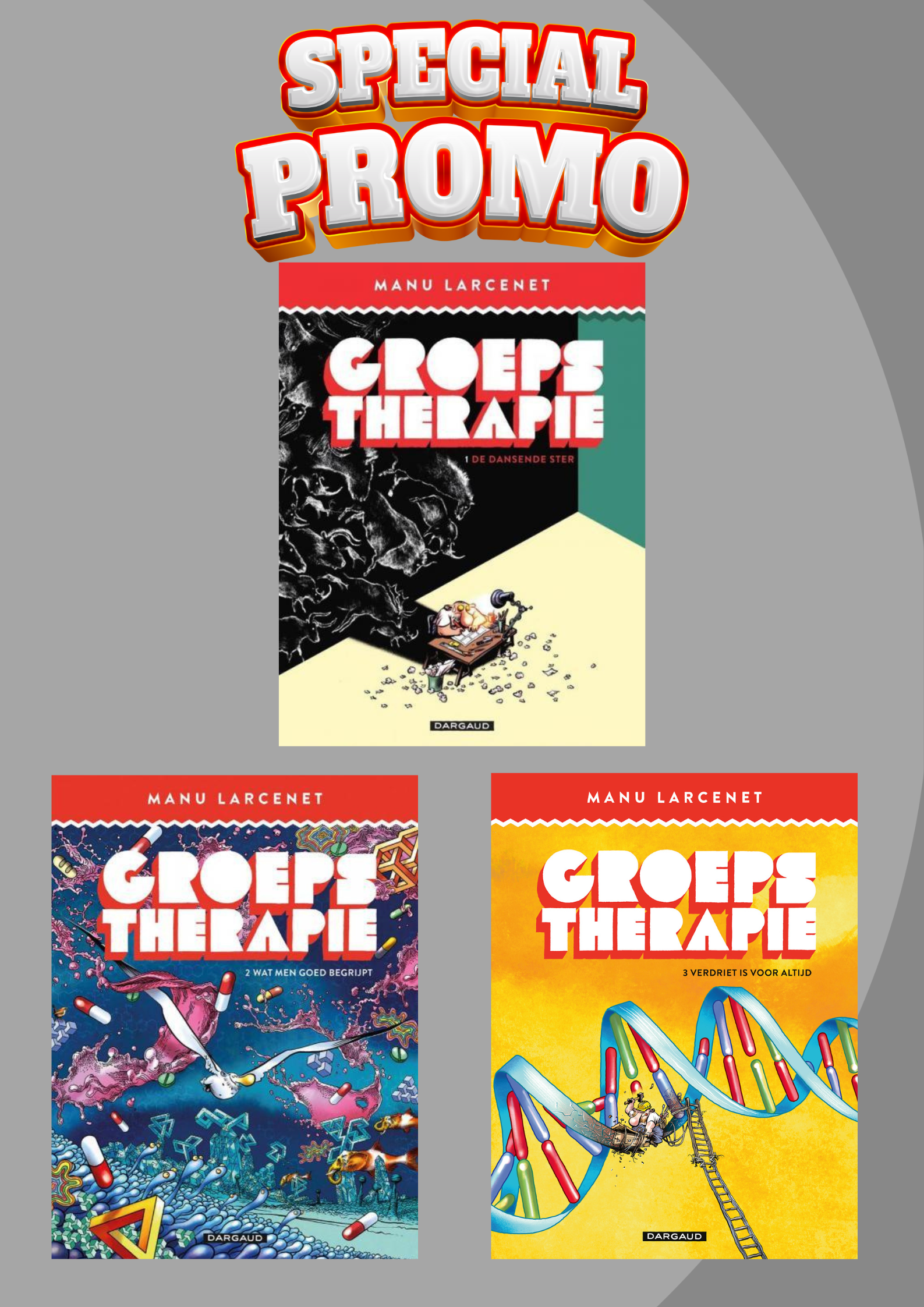 Groepstherapie is een schitterend verhaal van Manu Larcenet over een stripmaker – niemand minder dan Larcenet zelf – op zoek naar inspiratie. In een voortdurende zoektocht doorkruist hij de wereld van de creatie. Hij duikt de geschiedenis in, doet een oproep aan de grootste schilders, raadpleegt Boileau, Nietzsche en God Himself. Niet elke dichter kan humor met wanhoop rijmen, en toch slaagt Manu Larcenet net daarin met dit grappig, ontroerend en opzienbarend album. Hij maakt van elke tekening, elke pagina, elke tegenslag een hilarisch en aangrijpend moment. Tegenover de benauwing van de creatie plaatst hij zichzelf, naakt, zonder veinzerij of trukendoos. Hij trekt op een prachtige ontdekkingstocht, doordrongen van verrassende humor en een hartverscheurende waarheid op zoek naar de goddelijke inspiratie, of eender welke inspiratie, gewoon… al is het maar een miniem stukje inspiratie… iets… want zonder inspiratie is een kunstenaar niets. Manu Larcenet toont zich in Groepstherapie weer meester van de humor en creëert een unieke sfeer die je als lezer meteen meetrekt, recht naar de afgrond die gaapt voor de voeten van de inspiratieloze artiest.