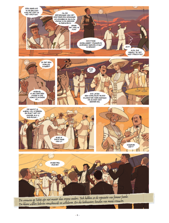 Het uitbreken van de Eerste Wereldoorlog in Europa verandert niets aan de feestgewoonten van de jet set op Tahiti. Ondertussen bedreigen twee Duitse cruisers het paradijselijk eiland. Dat zorgt voor paniek op Tahiti! Het zorgeloze en hemelse eiland wordt gebombardeerd door Duitse kruisers! In deze chaos waagt een meedogenloze seriemoordenaar zijn kans en vermoordt jonge Hula-meisjes. Simon Combaud, een jonge Parijzenaar is net op het eiland gearriveerd, en meent het spoor te volgen van een misdaad die vijftien jaar eerder in Parijs plaatsvond. Deze lijkt verband te houden met de recente moorden. Maar in de beroering van de Eerste Wereldoorlog blijft de kleine gemeenschap verenigd tegen deze vreemde indringer. Hij kan alleen op zichzelf vertrouwen om deze gruwelijke misdaden op te lossen ... Op basis van een onbekend historisch feit (de aanval van Tahiti door Duitse schepen) en tegen een achtergrond van kolonisatie en oorlog, schreven de auteurs een politiethriller die zowel intens als verrassend is!