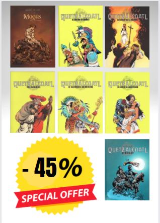 PROMOPAKKKET MET DE 7 DELEN SC ALLERLAATSTE PAKKET 1525. Tenochtitlan, de wonderbaarlijke hoofdstad van het Azteekse keizerrijk, is gevallen, verwoest en ontmanteld door de Spaanse soldaten, en het proces in Vera Cruz waar Maïana Xochitla voor haar rechters verschijnt, komt ten einde. Gefolterd en gemarteld moet de jonge indiaanse, die de courtisane en de maîtresse van Moctezuma en van Cortés was, die tegelijk medeplichtige als slachtoffer was van de slachting van haar volk, antwoorden op de enige vraag waar het tribunaal en het Spaanse hof koortsachtig naar op zoek zijn: waar is de schat van de Azteken verstopt? Tegenover haar heroïsche stomheid en haar onwrikbare geloof in de wraakgod Quetzalcoatl is het vonnis vreselijk, want niemand kan ongedeerd ontsnappen aan de seculiere arm van de Spaanse inquisitie ... Als scenarist en tekenaar stelt Jean-Yves Mitton een verhaal vol liefde en bloed voor, zoals hij dat graag vertelt. Een stripverhaal met filmeffect! Compleet verhaal in zeven delen.
