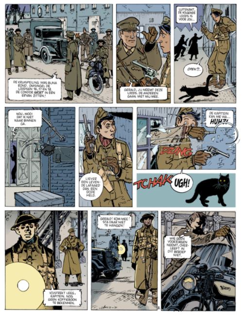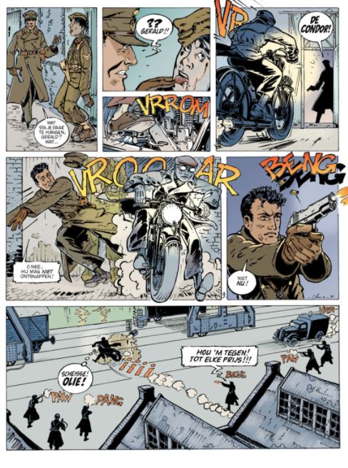 Klassieke leest Met dit fraai uitgegeven album diept Reboot Comics een oud verhaal uit het Nederlandse stripblad Sjosji op. Wie de hardcover koopt, krijgt er nog een los toegevoegd dossier bij dat de voorgeschiedenis van de korte stripreeks uit de doeken doet en het perfectionisme van tekenaar Anco Dijkman duidelijk maakt. Dat gebeurt niet alleen in woord, maar ook in de vorm van afgekeurde pagina's die hij hertekende, meestal omdat de storytelling of de dynamiek in de eerste versie voor hem niet goed zat. Gelijk heeft ie! Voordat het tot het lange verhaal De Vlucht van de Condor kwam, maakten Dijkman en scenarist Jacques Post (De Partners, De Meimoorden) al drie korte verhalen van Soames & Co. Het eerste wil de tekenaar niet meer onder ogen zien. Zonde, want zo mist Reboot Comics een kans om een soort integrale van de complete reeks uit te geven en missen wij wat noodzakelijke inleiding om de personages beter te leren kennen. In eerste instantie is dat de Britse kapitein Soames die voor MI5, de binnenlandse veiligheidsdienst werkt. In De Vlucht van de Condor krijgt hij in 1940, terwijl Londen wordt geteisterd door Duitse bommenwerpers, de duidelijk omschreven taak om de mysterieuze spion De Condor te pakken te krijgen en te voorkomen dat hij Engeland ontvlucht met wetenschapper Briggs die aan een nieuw project werkt. Deze laatste blijkt een oude liefdesrivaal te zijn van Soames, dus het is persoonlijk. Soames kan rekenen op een bescheiden team medewerkers, de co" uit de reeksnaam, om zijn missie te volbrengen. Balfour is een voormalig gewichtheffer wiens kracht van pas komt, terwijl Rodgers de beste scherpschutter is die de kolonel van MI5 kent. En dan is er nog Fuzzy, de klungelende chauffeur van dienst.. omdat er niemand anders beschikbaar was. Fuzzy kan je gerust vergelijken met Ernest Laverdure of Sonny Tuckson, de grappige sidekicks in respectievelijk de ernstige luchtvaartreeksen Tanguy en Laverdure en Buck Danny. Het met vaart vertelde verhaal van Jacques Post is op klassieke leest geschoeid en doet denken aan die heerlijke weekbladperiodes van weleer, de jaren 1950 en 1960, toen jonge striplezertjes nog wekelijks naar de kiosk renden om het vervolg van hun geliefde avonturenreeksen te lezen, genre Jan Kordaat, Flip Flink, Blake en Mortimer en andere coryfeeën. Degelijke spanning verzekerd. Het realisme van Dijkman voegt daar een vintage scheut bovenop, terwijl zijn werk moderner oogt dan voornoemde stripvoorbeelden door een uitgekiende cameravoering, afwisseling en dynamiek door zijn bladschikkingen, die drie stroken per blad volgen, maar net zo goed doorbreken. De decors zijn knap uitgewerkt en heel geloofwaardig. Dijkman heeft voor de publicatie in Sjosji al zijn pagina's hertekend met een andere pen omdat hij niet meer tevreden was over zijn eerste werk. Voor deze nieuwe albumversie paste hij hier en daar weer prenten aan, maar ook de inkleuring is volledig overnieuw gedaan. Het is een somberder palet geworden dat voor ons prima aansluit bij de oorlogsperiode. Dijkmans stripproductie is niet uitgebreid. Bij Uitgeverij Personalia verscheen vorig jaar nog een album van zijn ook al oudere verhaal Scarlet Edge. Teleurgesteld in gebroken beloften en het moeizame proces door zijn eigen perfectionisme, koos de in 1965 geboren tekenaar medio jaren 1990 al voor een andere carrière waarbij hij nog steeds kon en kan tekenen (storyboards, 3D-ontwerper voor videogames en aanverwante zaken) en waarover hij ook les geeft. Reboot Comics deed er goed aan om een striphoofdstukje uit zijn verleden op te rakelen zodat lezers anno nu er ook (weer) van kunnen genieten."